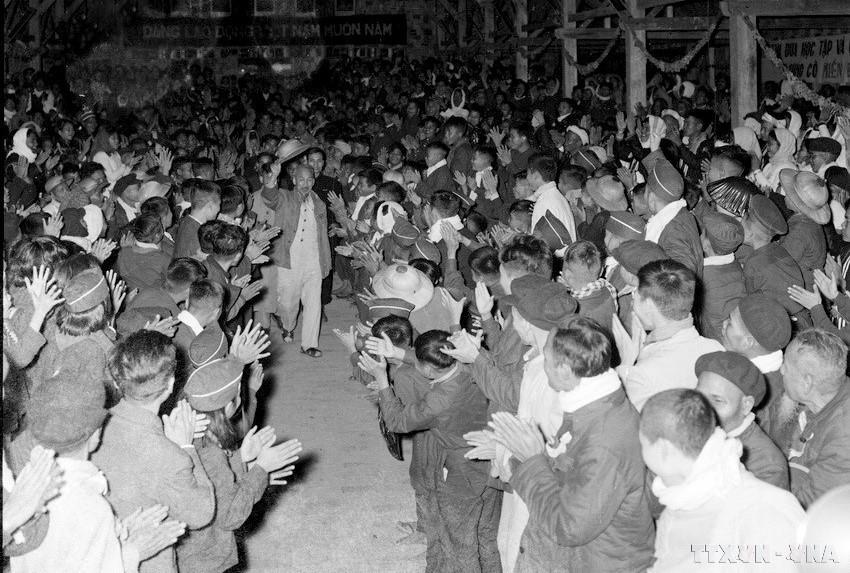 Hồ Chủ tịch nói chuyện với các đại biểu về dự hội nghị của Đảng để quyết định đưa Đảng ra hoạt động công khai (3/3/1951). Ảnh: TTXVN