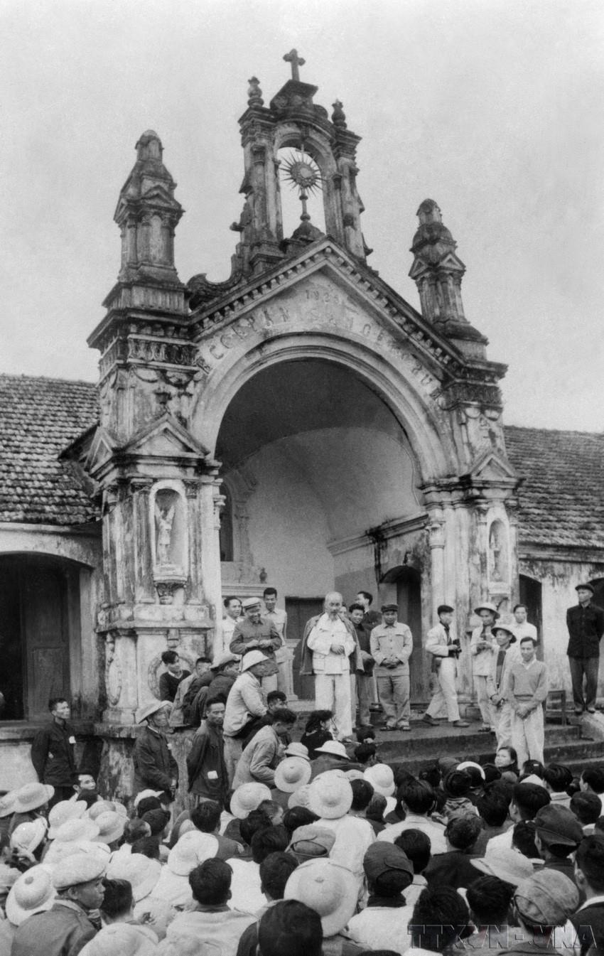 Chủ tịch Hồ Chí Minh về thăm hỏi và nói chuyện với đồng theo đạo Thiên Chúa ở thôn Thạch Bích, xã Bích Hòa, huyện Thanh Oai, Hà Đông (nay là Hà Nội) ngày 5/12/1959. Ảnh: TTXVN