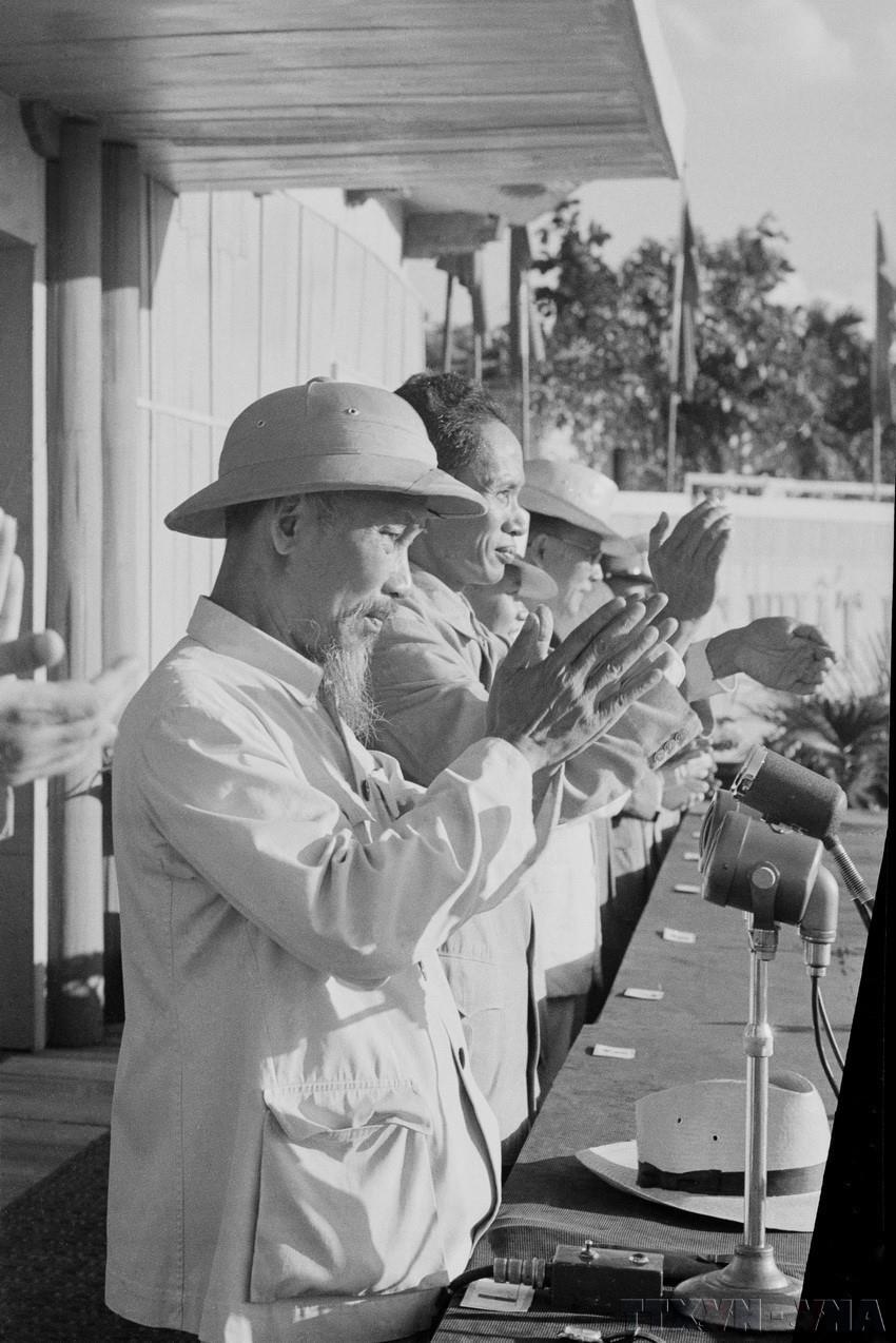 Chủ tịch Hồ Chí Minh vẫy chào nhân dân Thủ đô tuần hành chào mừng kỷ niệm lần thứ 12 ngày thành lập nước Việt Nam Dân chủ cộng hòa (2/9/1957). Ảnh: TTXVN
