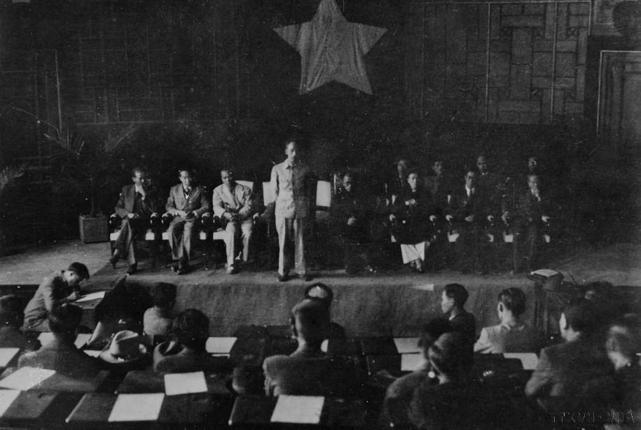 Sau cách mạng tháng 8/1945, Ủy ban Giải phóng dân tộc do Quốc dân đại hội Tân Trào cử ra, đã về Hà Nội ngày 25/8/1945, được cải tổ thành Chính phủ Lâm thời do Chủ tịch Hồ Chí Minh làm Chủ tịch Chính phủ. Trong ảnh: Chủ tịch Hồ Chí Minh và các thành viên chính phủ ra mắt các đại biểu tầng lớp nhân dân Thủ đô. Ảnh: TTXVN