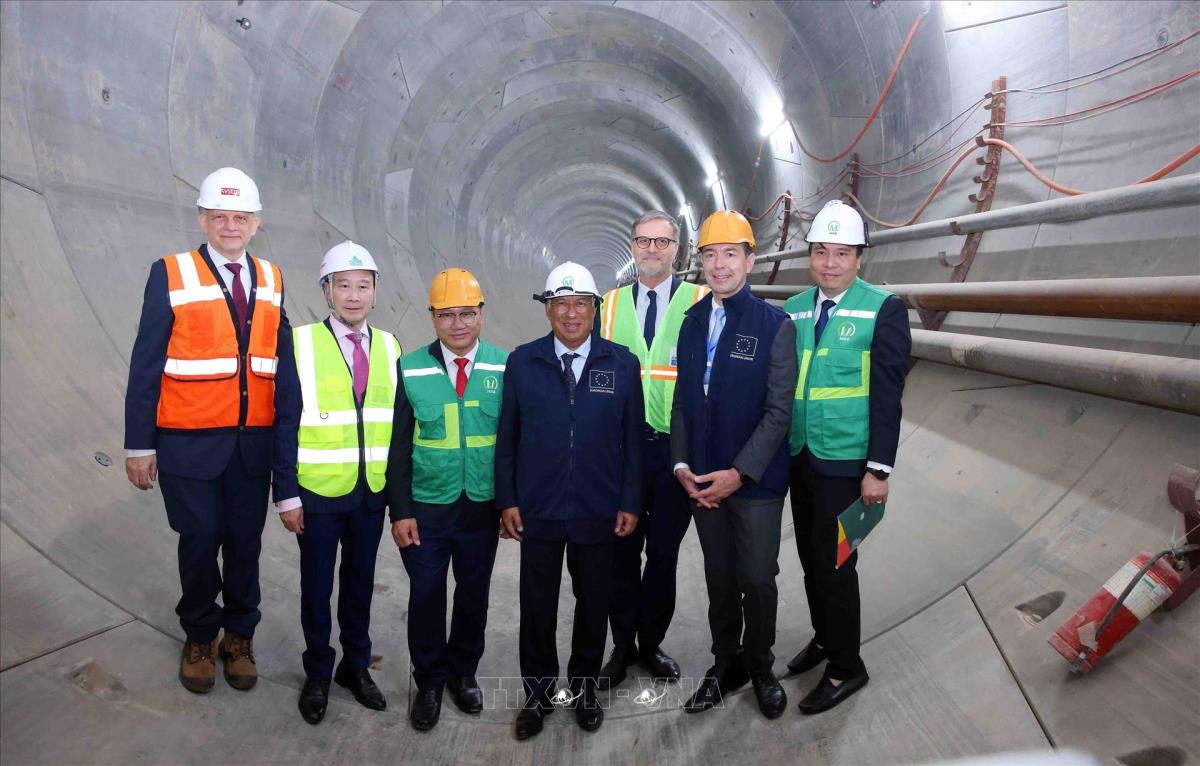 Chủ tịch Hội đồng châu Âu António Costa với các đại biểu tại dự án metro tuyến số 3 (29/1/2026). Ảnh: Phạm Kiên - TTXVN