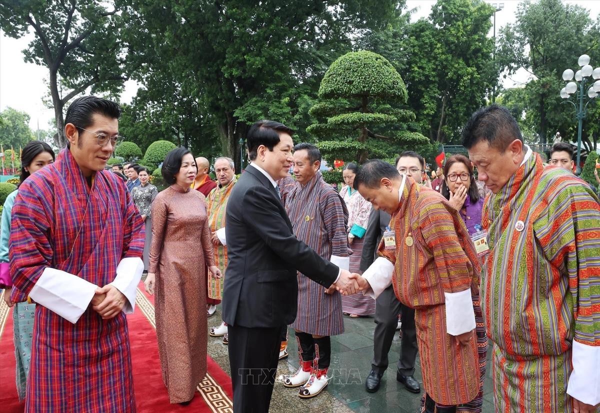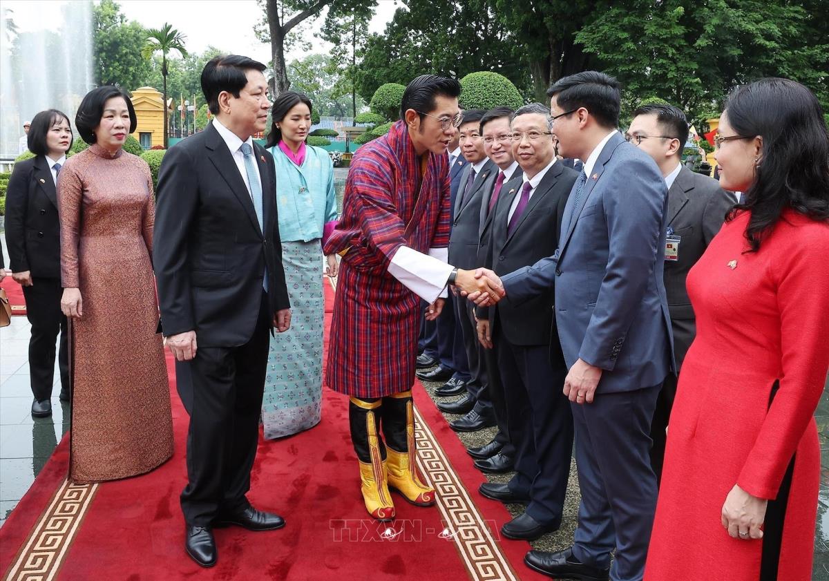 Chủ tịch nước Lương Cường giới thiệu đoàn Việt Nam với Quốc vương Bhutan Jigme Khesar Namgyel Wangchuck (19/8/2025). Ảnh: Lâm Khánh – TTXVN