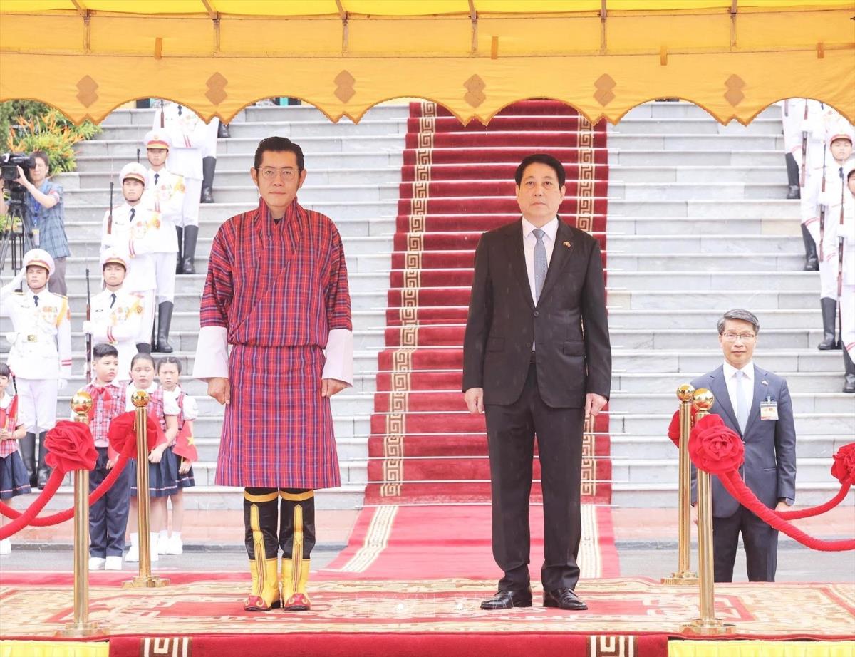 Chủ tịch nước Lương Cường và Quốc vương Bhutan Jigme Khesar Namgyel Wangchuck trên bục danh dự nghe quân nhạc cử Quốc thiều hai nước (19/8/2025). Ảnh: Lâm Khánh – TTXVN