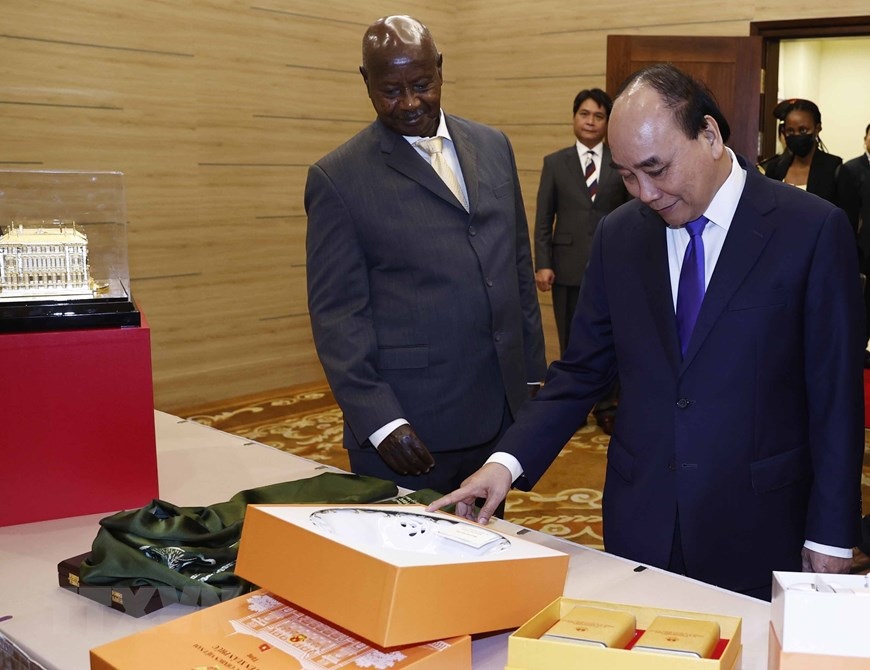 Chủ tịch nước Nguyễn Xuân Phúc và Tổng thống nước Cộng hòa Uganda Yoweri Kaguta Museveni trao đổi tặng phẩm. (Ảnh: Thống Nhất/TTXVN)