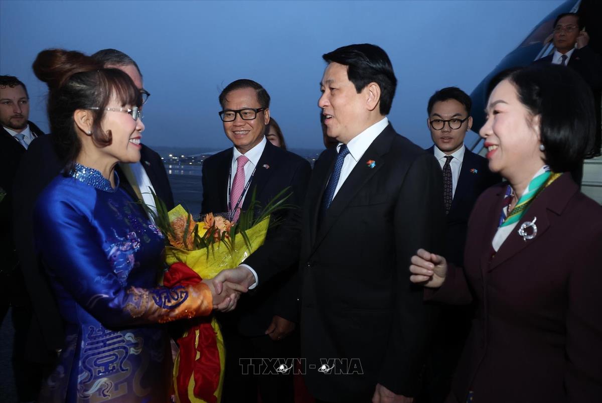 Chủ tịch nước Lương Cường và Phu nhân đến Trung tâm bàn giao máy bay của Boeing tại bang Washingon (Hoa Kỳ). Ảnh: Lâm Khánh - TTXVN