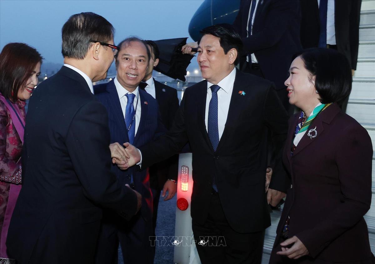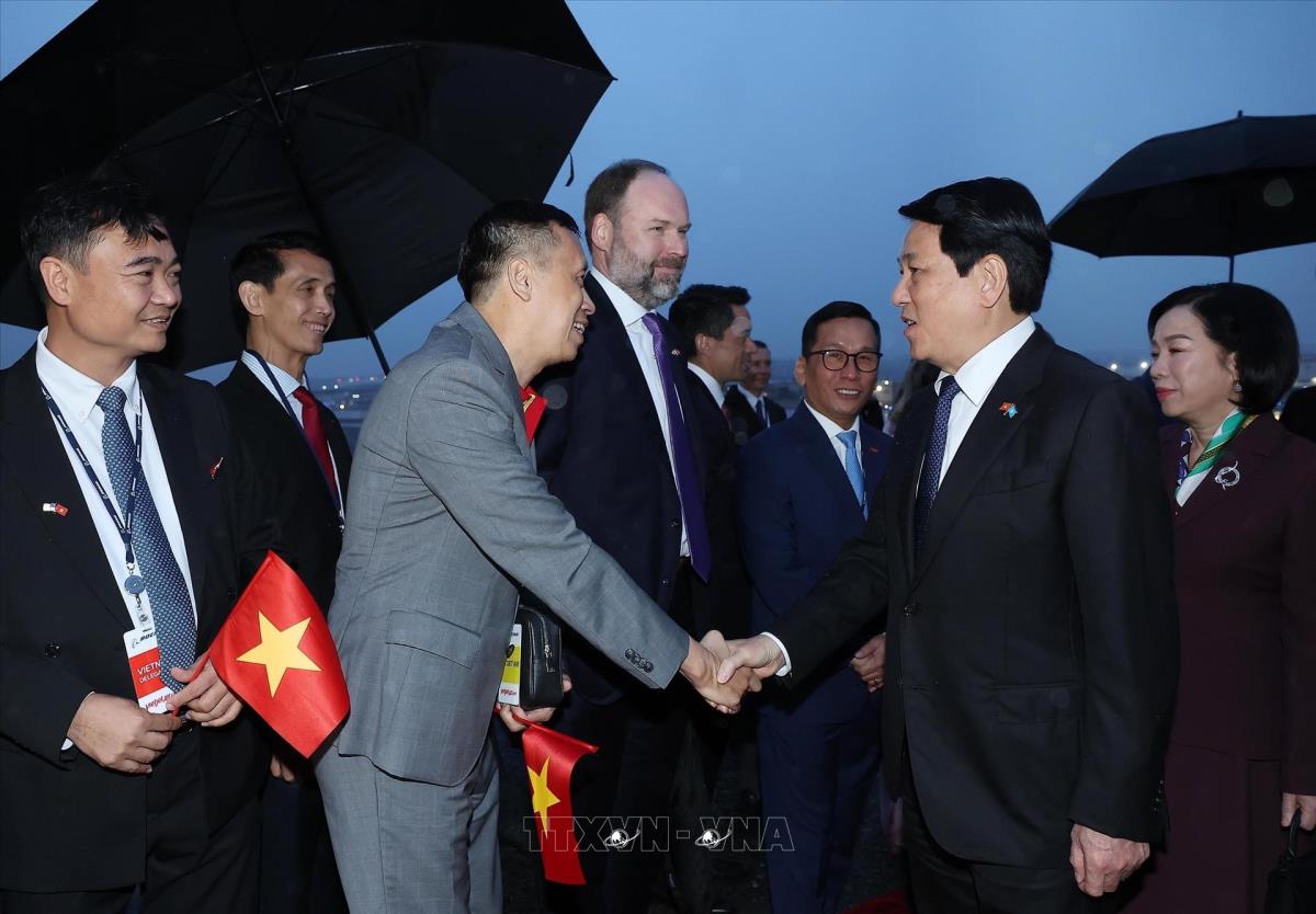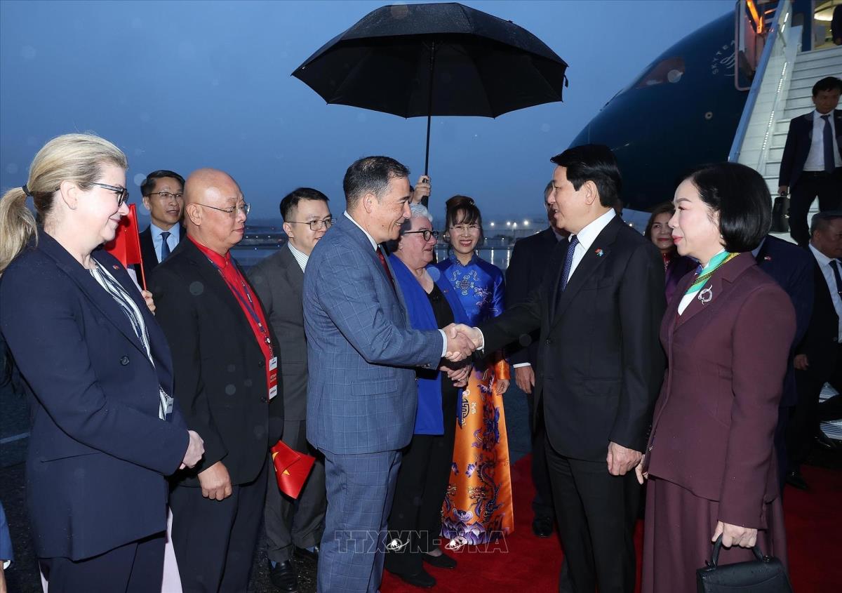 Các đại biểu đón Chủ tịch nước Lương Cường và Phu nhân tại sân bay Boeing Field Seattle, bang Washingon (Hoa Kỳ, sáng 21/9/2025, giờ địa phương). Ảnh: Lâm Khánh - TTXVN