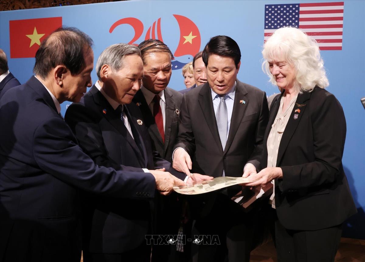 Chủ tịch nước Lương Cường cùng các cựu chiến binh, gia đình cựu chiến binh Việt Nam và Hoa Kỳ xem lại những kỷ vật, tư liệu (22/9/2025). Ảnh: Lâm Khánh – TTXVN