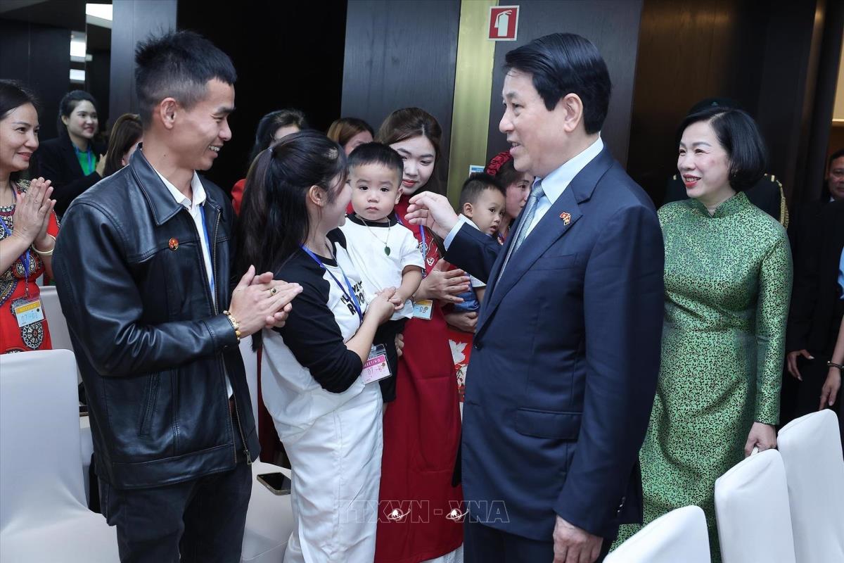 Chủ tịch nước Lương Cường và Phu nhân với đại diện cộng đồng người Việt Nam tại Angola (8/8/2025). Ảnh: Lâm Khánh - TTXVN