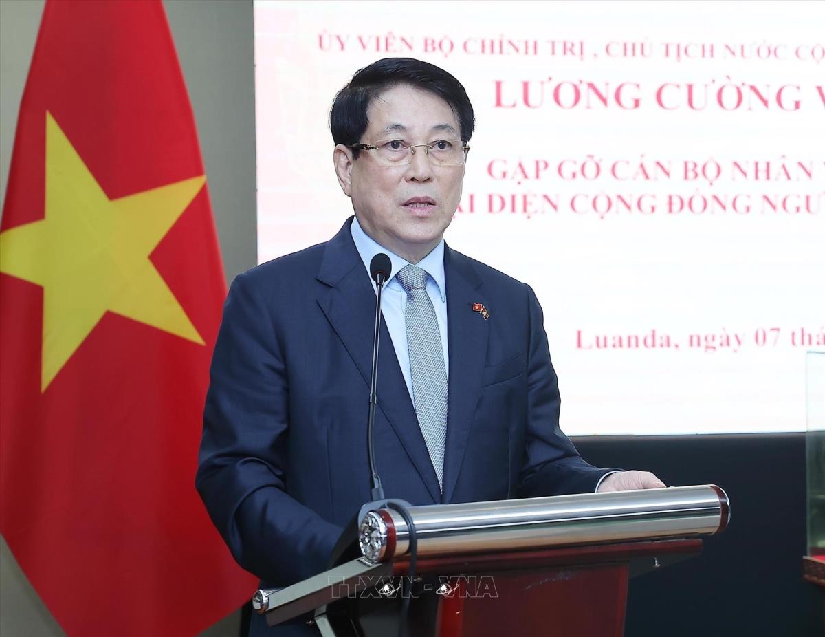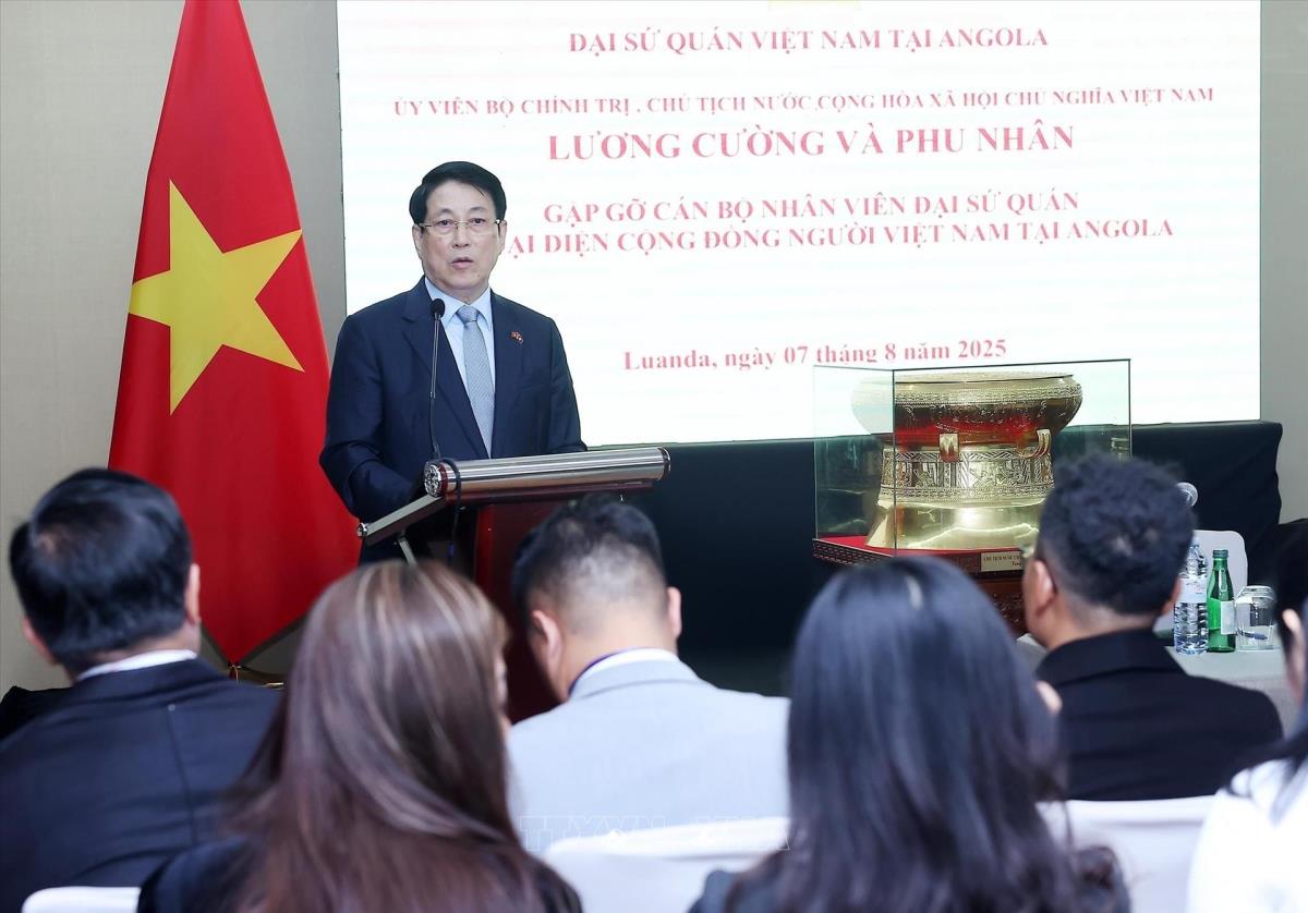 Chủ tịch nước Lương Cường nói chuyện với cán bộ, nhân viên Đại sứ quán và cộng đồng người Việt Nam tại Angola (8/8/2025). Ảnh: Lâm Khánh - TTXVN