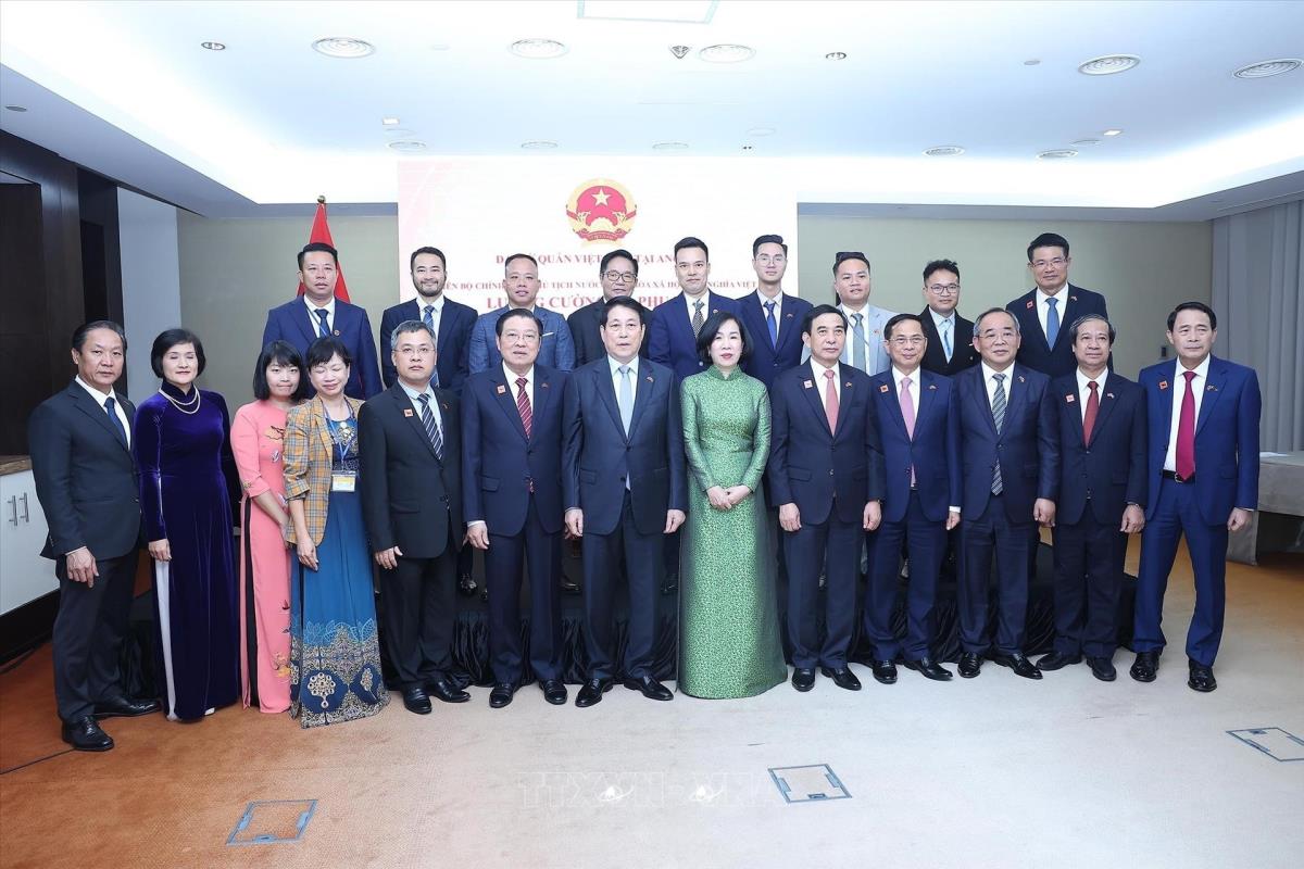 Chủ tịch nước Lương Cường, Phu nhân và các đại biểu với cán bộ, nhân viên Đại sứ quán và đại diện cộng đồng người Việt Nam tại Angola (8/8/2025). Ảnh: Lâm Khánh - TTXVN
