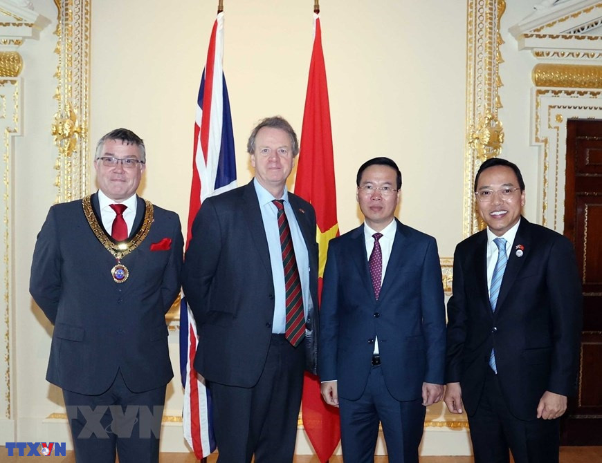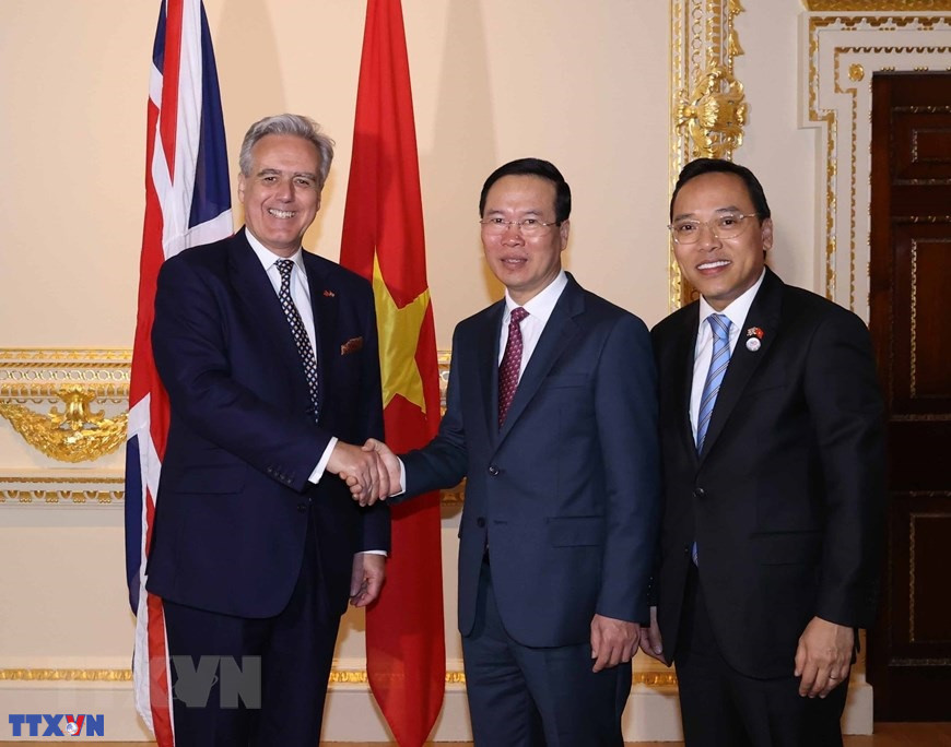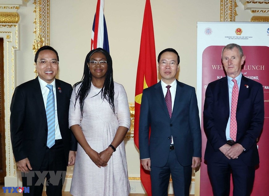 Chủ tịch nước Võ Văn Thưởng với Phó Chủ tịch Hạ viện Anh Nigel Evans và Bộ trưởng Kinh doanh và Thương mại Anh Kemi Badenoch. (Ảnh: Thống Nhất/TTXVN)