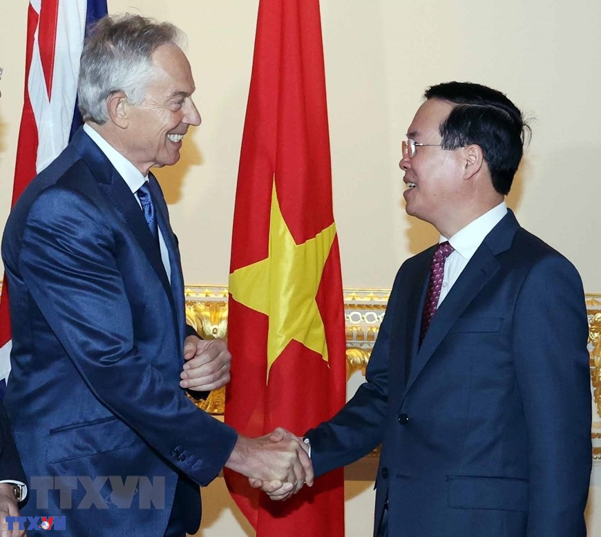 Chủ tịch nước Võ Văn Thưởng gặp cựu Thủ tướng Anh Tony Blair. (Ảnh: Thống Nhất/TTXVN)