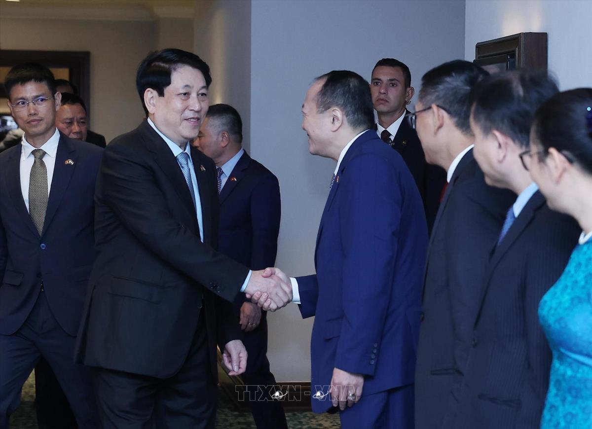 Hà Nội (TTXVN 3/8/2025) Nhân chuyến thăm cấp Nhà nước tới Ai Cập, chiều 3/8/2025, giờ địa phương (tối cùng ngày, giờ Hà Nội), tại thủ đô Cairo, Chủ tịch nước Lương Cường làm việc với các Đại sứ Việt Nam tại khu vực châu Phi.