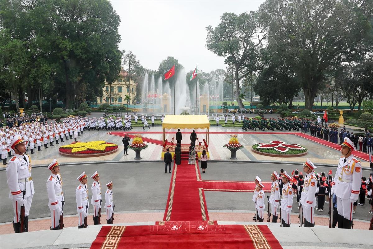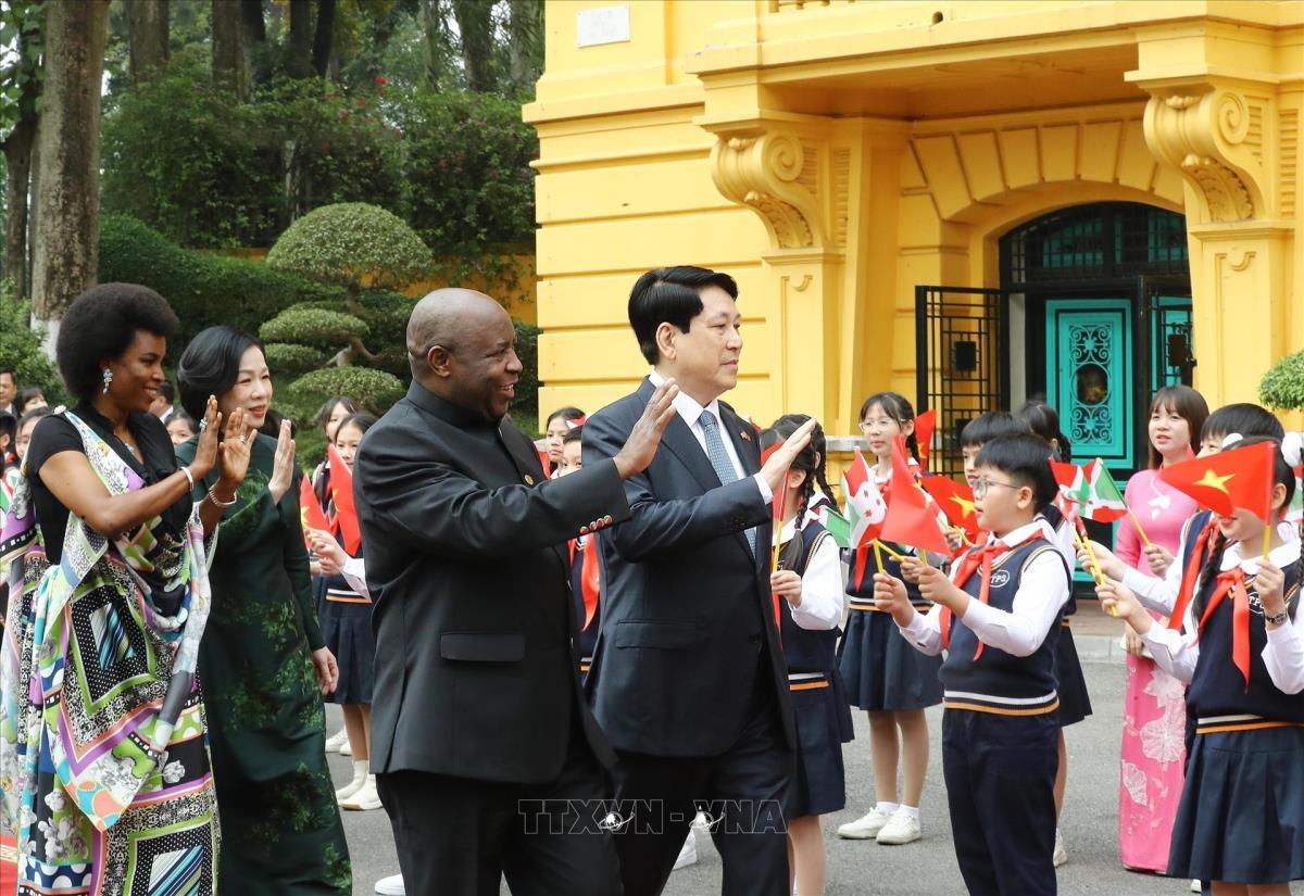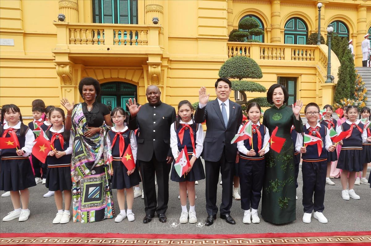 Hà Nội (TTXVN 4/4/2025) Sáng 4/4/2025, tại Phủ Chủ tịch, Chủ tịch nước Lương Cường và Phu nhân chủ trì Lễ đón Tổng thống nước Cộng hòa Burundi Évariste Ndayishimiye và Phu nhân thăm chính thức Việt Nam.