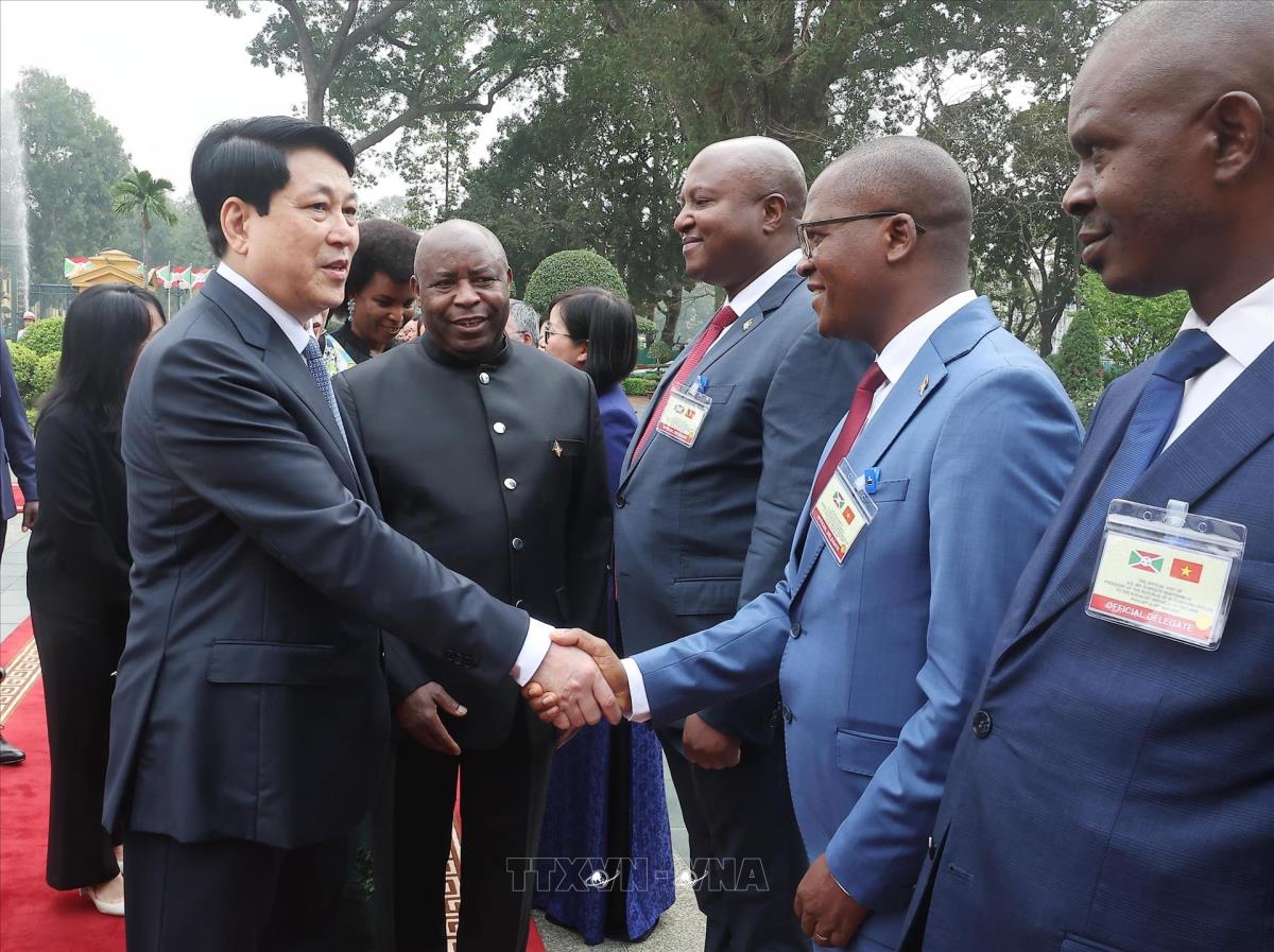 Chủ tịch nước Lương Cường với các đại biểu đoàn Cộng hòa Burundi (4/4/2025). Ảnh: Lâm Khánh TTXVN