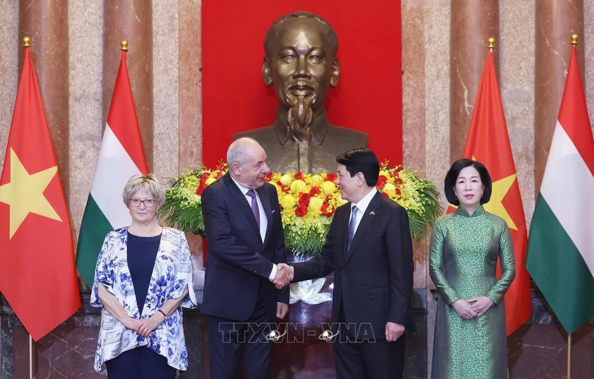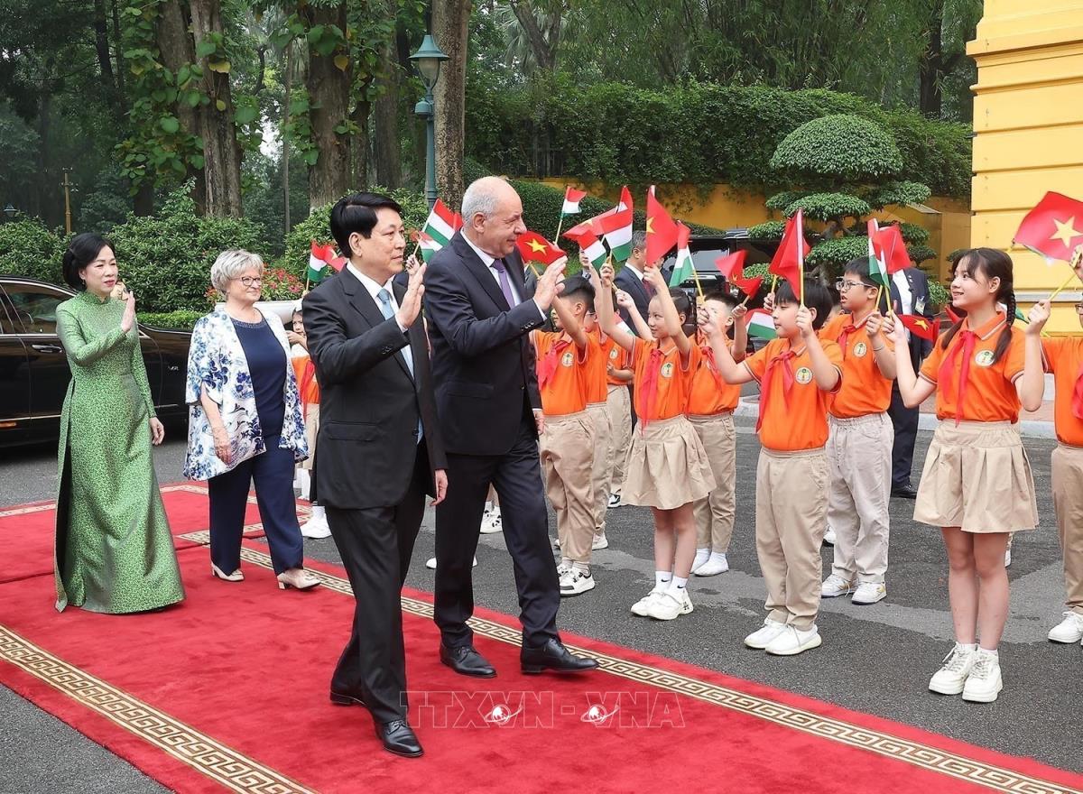 Chủ tịch nước Lương Cường và Phu nhân đón Tổng thống Hungary Sulyok Tamas và Phu nhân (28/5/2025). Ảnh: Lâm Khánh – TTXVN