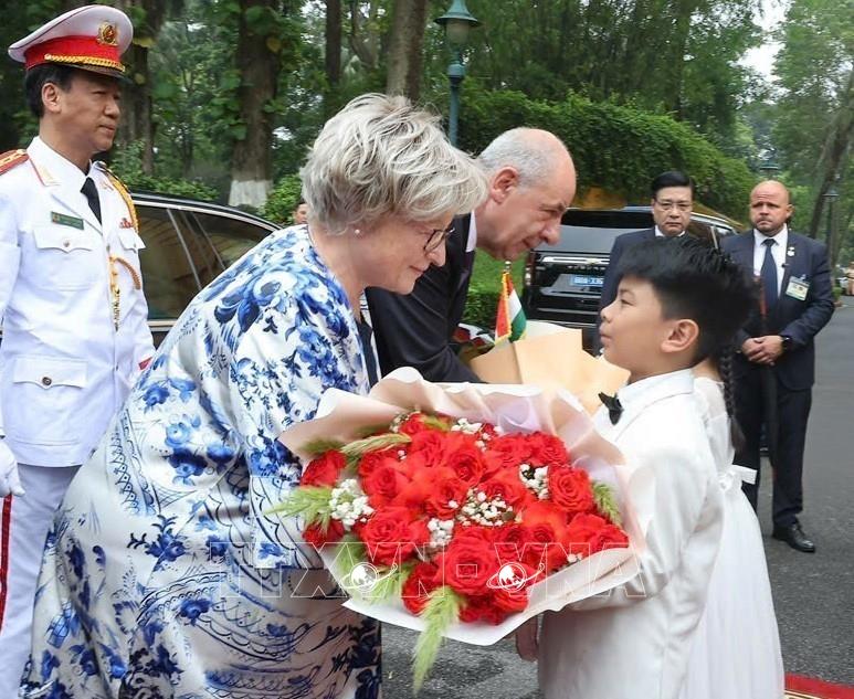 Thiếu nhi Thủ đô Hà Nội tặng hoa, chào mừng Tổng thống Hungary Sulyok Tamas và Phu nhân thăm chính thức Việt Nam (28/5/2025). Ảnh: Lâm Khánh – TTXVN