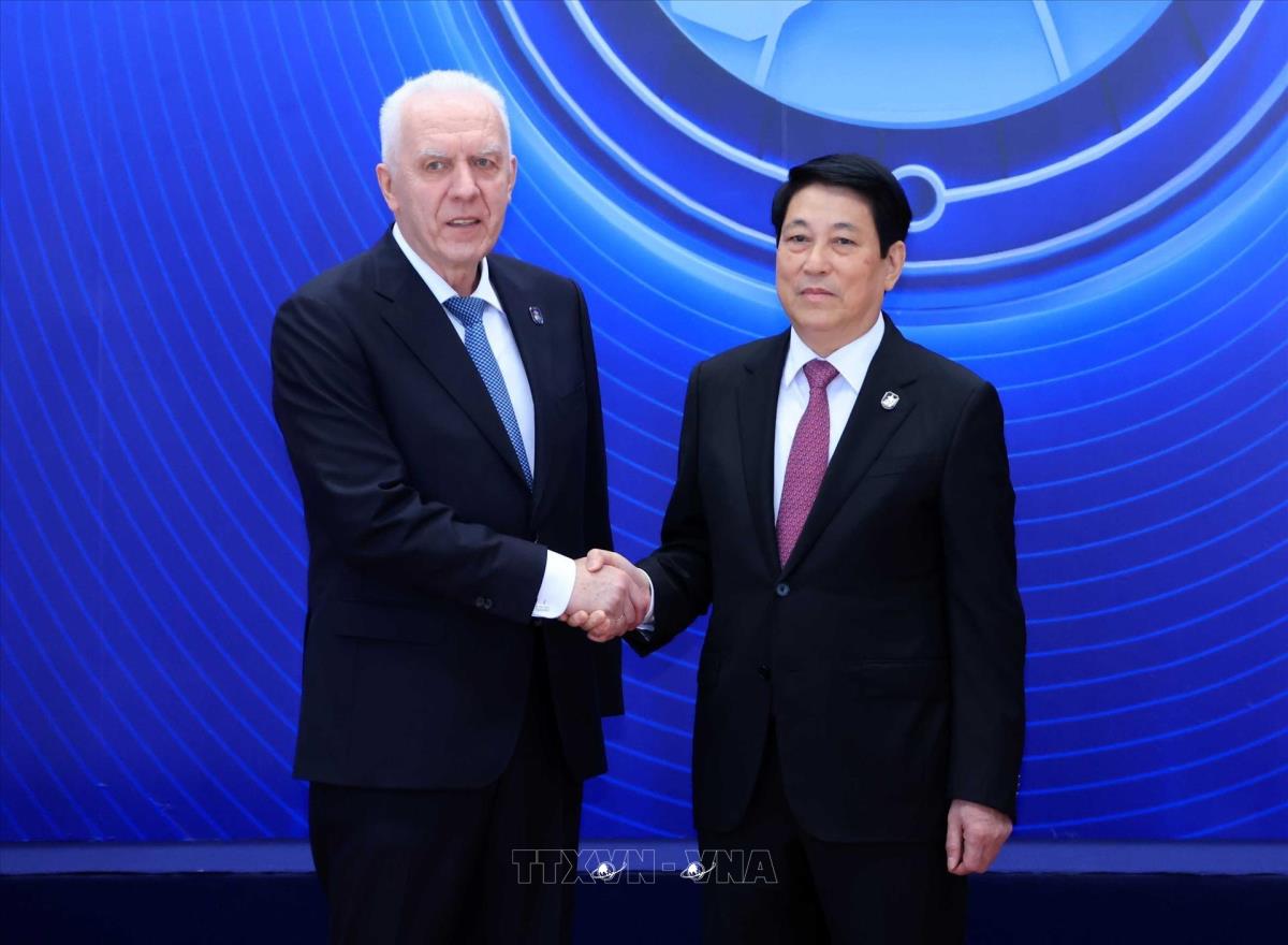 Chủ tịch nước Lương Cường đón Tổng Công tố Nga Alexander Vladimirovich Gutsan dự Lễ mở ký Công ước Hà Nội (25/10/2025). Ảnh: Lâm Khánh – TTXVN
