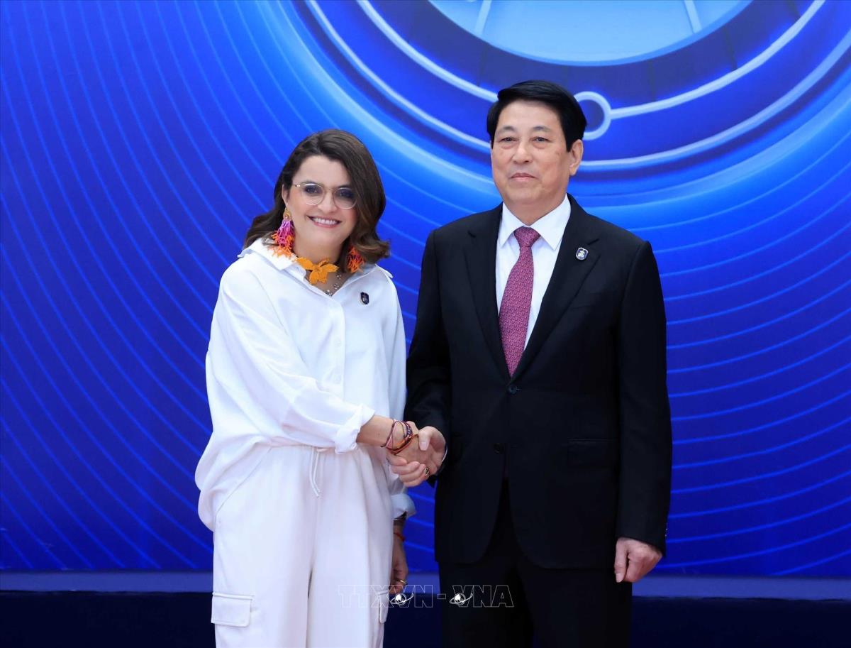 Chủ tịch nước Lương Cường đón Phó Tổng thống Ecuador María José Pinto González Artigas dự Lễ mở ký và Hội nghị cấp cao Công ước Liên hợp quốc về chống tội phạm mạng tại Hà Nội, từ ngày 25-26/10/2025. Ảnh: Lâm Khánh – TTXVN