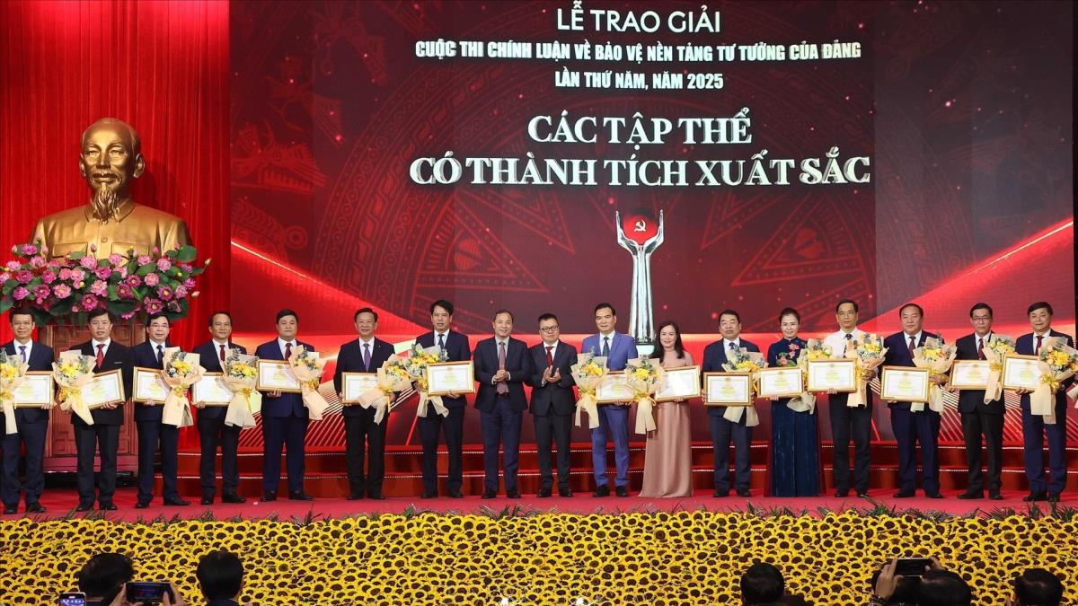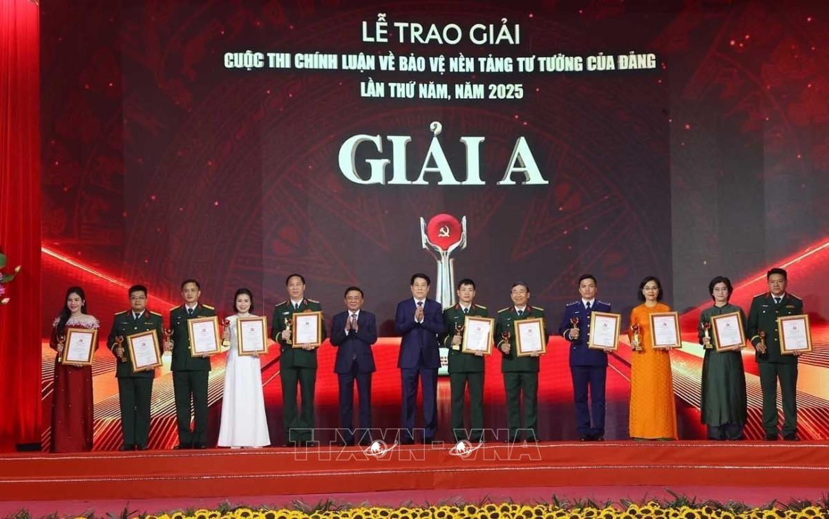 Hà Nội (TTXVN 22/10/2025) Tối 22/10, tại Hà Nội, Ủy viên Bộ Chính trị, Chủ tịch nước Lương Cường cùng Ủy viên Bộ Chính trị, Thường trực Ban Bí thư Trung ương Đảng, Trưởng Ban Chỉ đạo 35 Trung ương Trần Cẩm Tú đã tới dự và trao các giải A cho những tác giả đoạt giải tại Lễ trao giải Cuộc thi Chính luận về Bảo vệ nền tảng tư tưởng của Đảng lần thứ Năm - năm 2025.