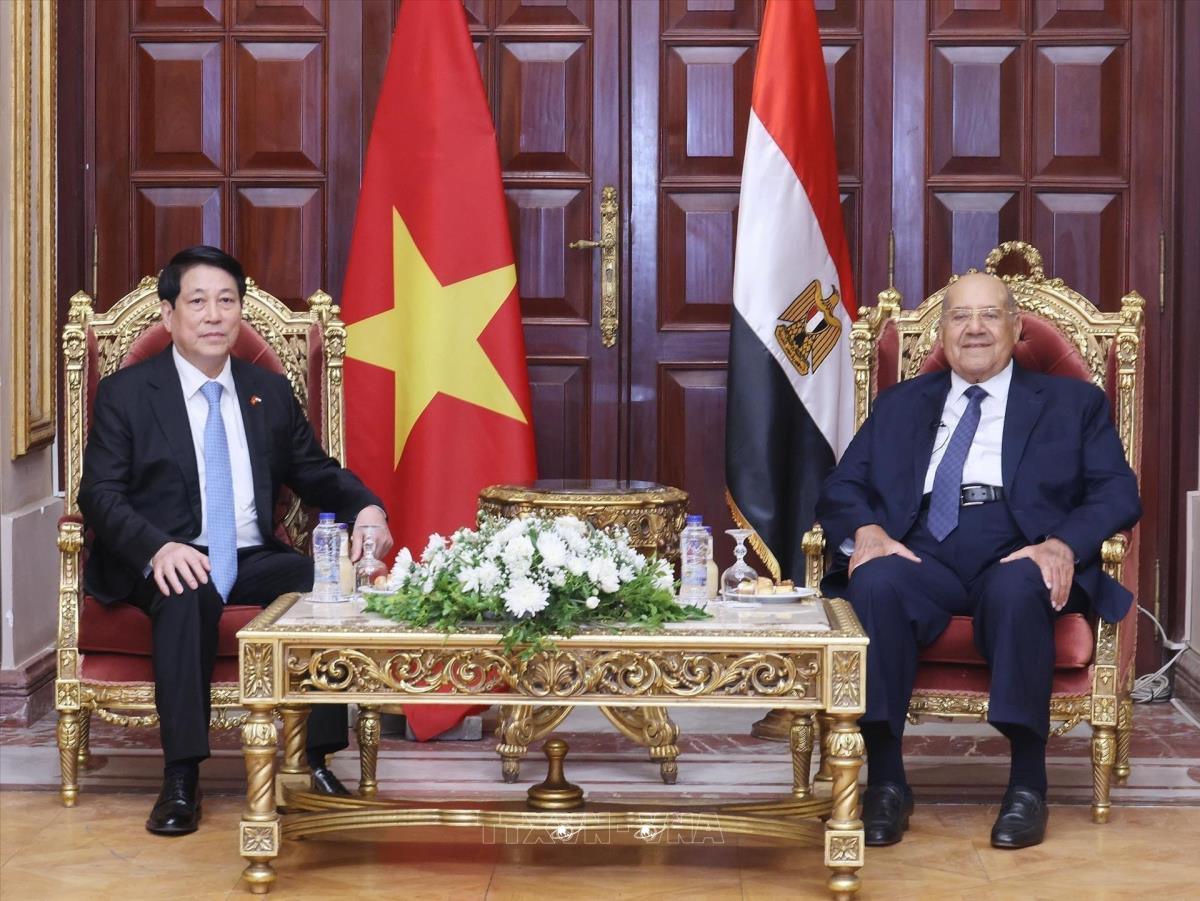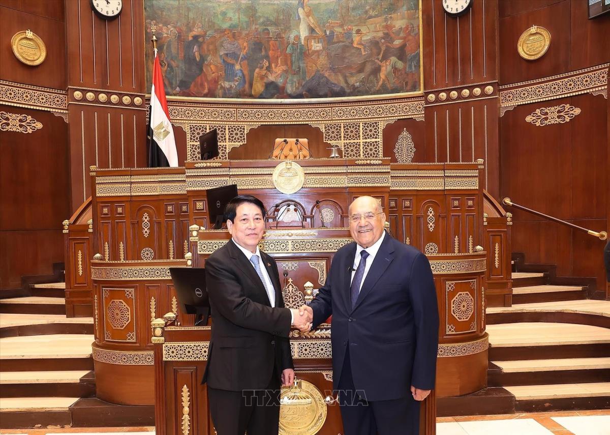 Chủ tịch nước Lương Cường và Chủ tịch Thượng viện Ai Cập Abdel-Wahab Abdel-Razek tại Trụ sở Thượng viện Ai Cập (6/8/2025). Ảnh: Lâm Khánh - TTXVN