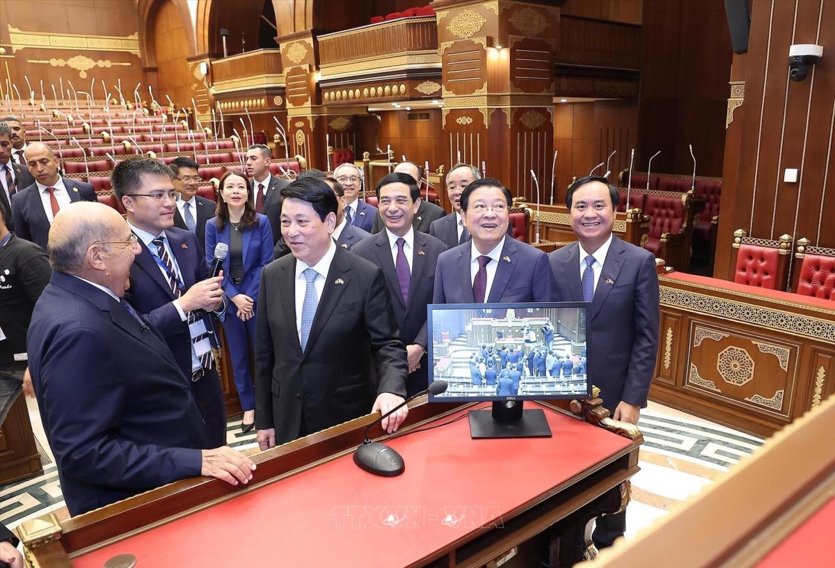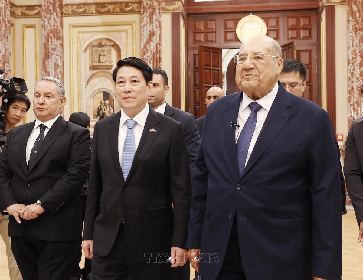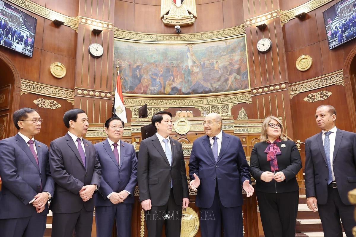 Chủ tịch Thượng viện Ai Cập Abdel-Wahab Abdel-Razek giới thiệu với Chủ tịch nước Lương Cường về trụ sở Thượng viện Ai Cập (6/8/2025). Ảnh: Lâm Khánh - TTXVN