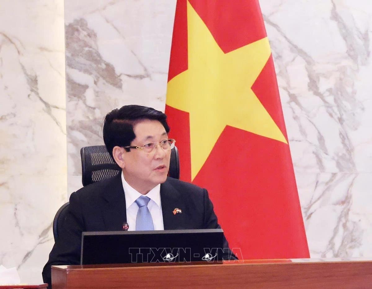 Chủ tịch nước Lương Cường tại cuộc hội kiến Thủ tướng Ai Cập Mostafa Madbouly (5/8/2025). Ảnh: Lâm Khánh - TTXVN