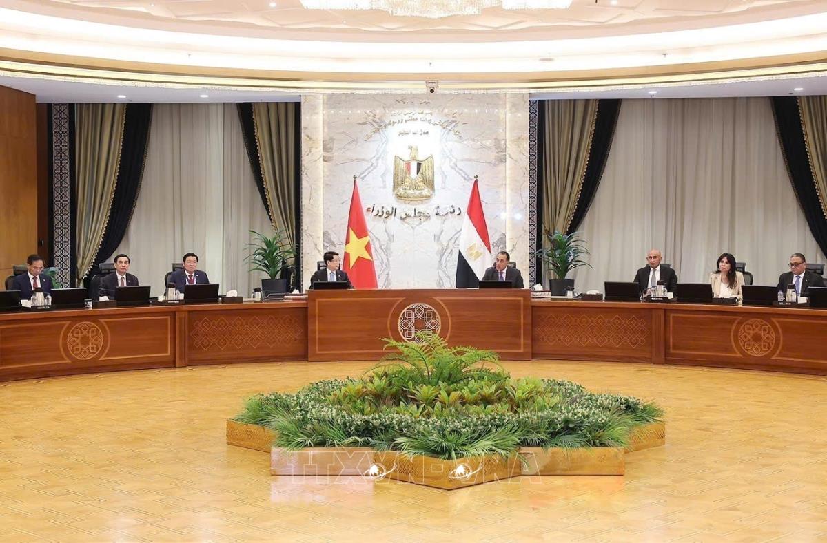 Hà Nội (TTXVN 5/8/2025) Trong chương trình thăm cấp Nhà nước tới Ai Cập, chiều 5/8/2025, giờ địa phương (tối cùng ngày, giờ Hà Nội), tại Phủ Thủ tướng ở Thủ đô hành chính mới (cách Cairo gần 50 km), Chủ tịch nước Lương Cường hội kiến Thủ tướng Ai Cập Mostafa Madbouly.