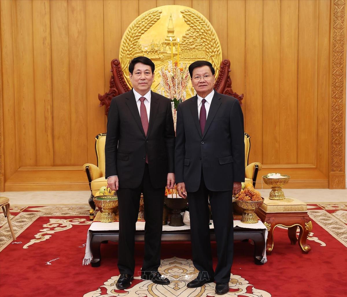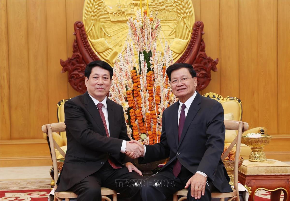 Tổng Bí thư, Chủ tịch nước Lào Thongloun Sisoulith buộc chỉ cho Chủ tịch nước Lương Cường (24/4/2025). Ảnh: Lâm Khánh – TTXVN