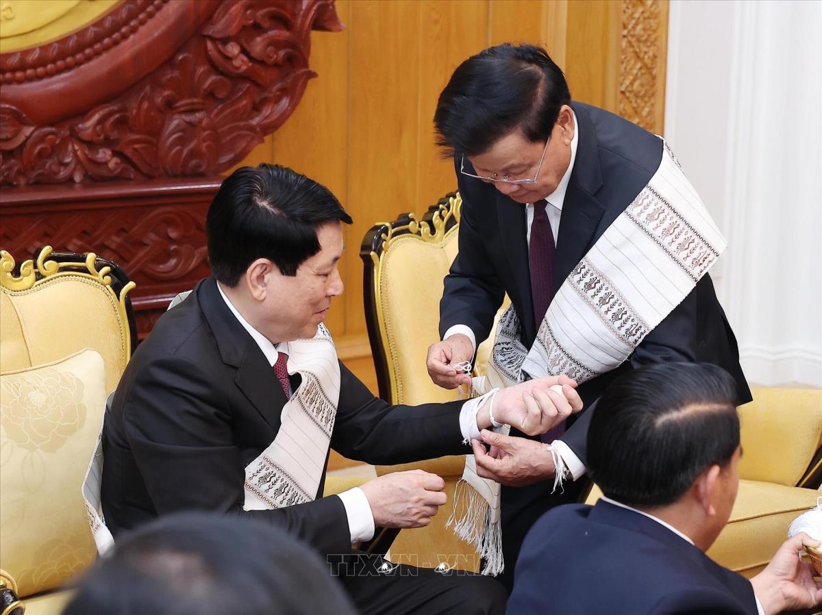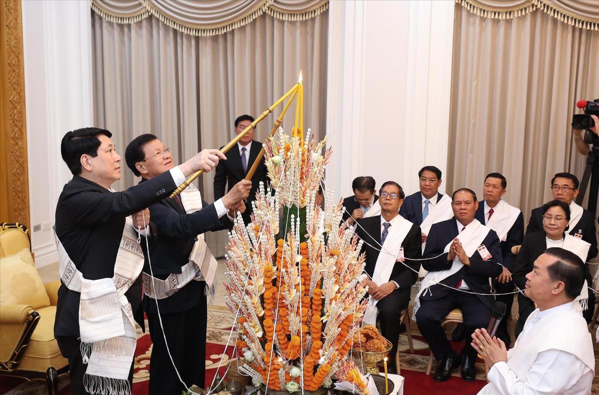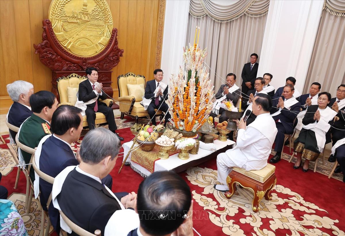 [Photo] Chủ tịch nước Lương Cường và Tổng Bí thư, Chủ tịch nước Thongloun Sisoulith dự lễ buộc chỉ truyền thống của Lào