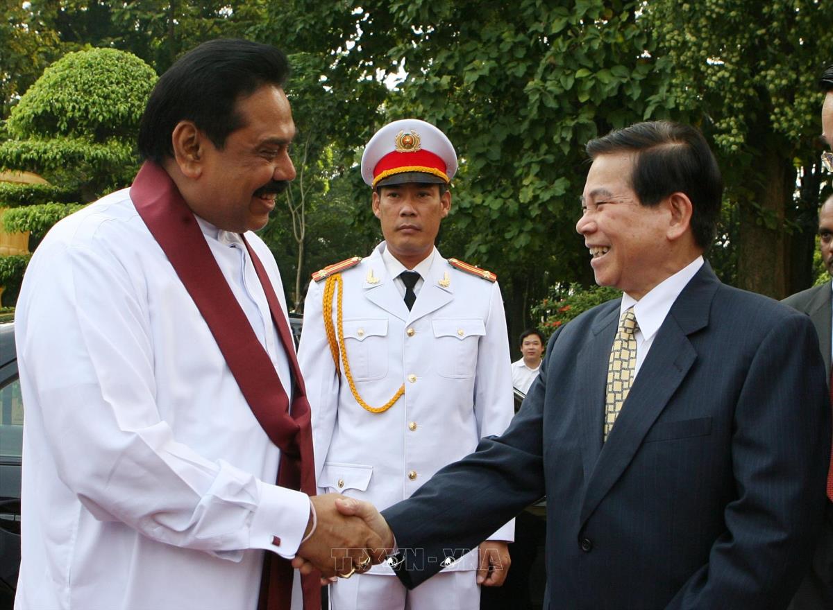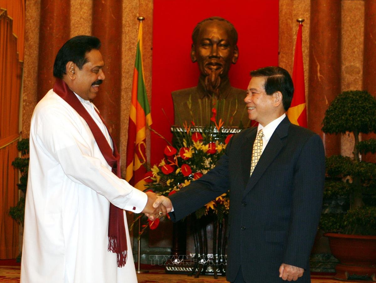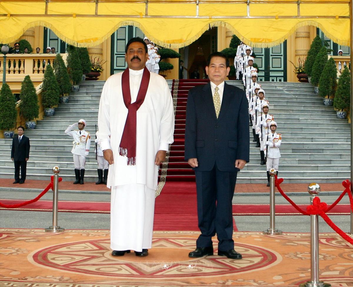 Chủ tịch nước Nguyễn Minh Triết đón Tổng thống CHXHCNDC Xri Lan-ca, Ngài Ma-hin-đa Ra-gia-pắc-xơ (22/10/2009). Ảnh: Nguyễn Khang - TTXVN