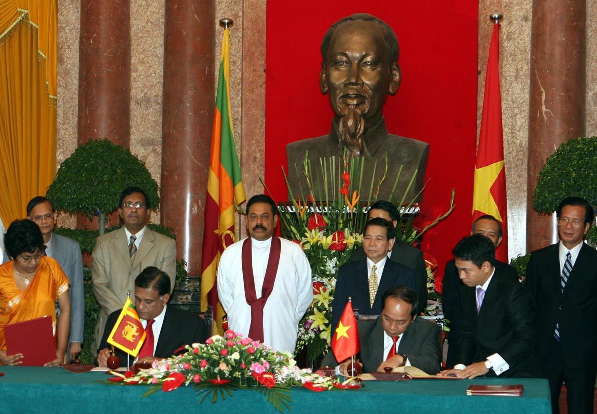 Chủ tịch nước Nguyễn Minh Triết và Tổng thống CHXHCNDC Xri Lan-ca, Ngài Ma-hin-đa Ra-gia-pắc-xơ chứng kiến lễ ký Hiệp định giữa Chính phủ Việt Nam và Chính phủ Xri Lan-ca về khuyến khích và bảo hộ đầu tư (22/10/2009). Ảnh: Nguyễn Khang - TTXVN