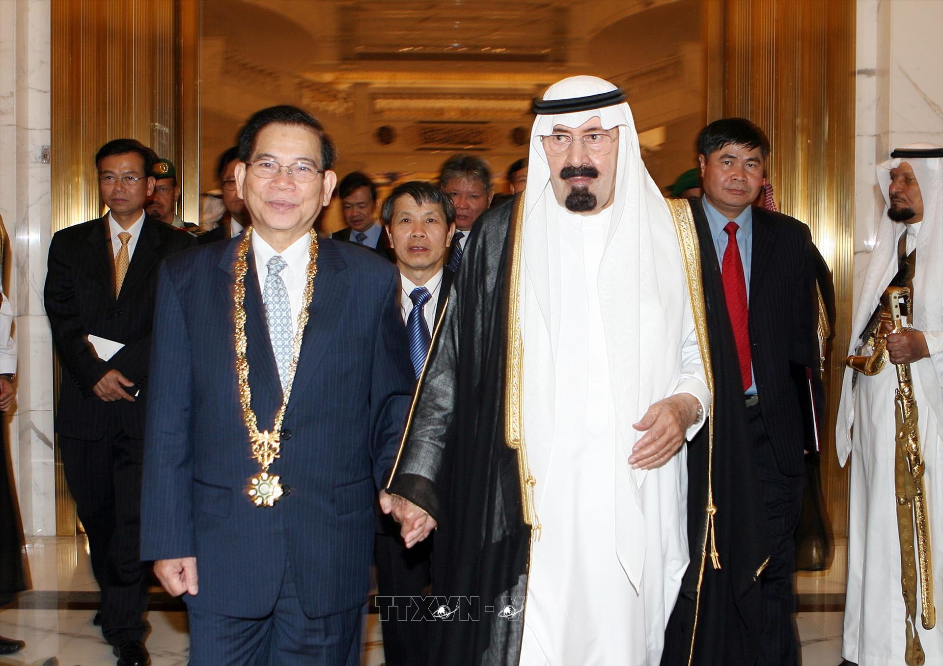 Quốc vương A-rập Xê-út Áp -đun-la Bin Áp-đun A-dít An Xa-út tặng Chủ tịch nước Nguyễn Minh Triết Huân chương Áp-đun A-dít. Ảnh: Nguyễn Khang - TTXVN