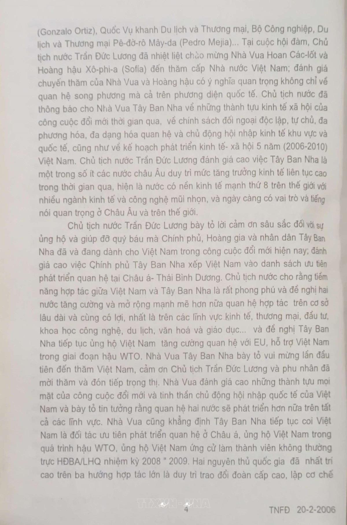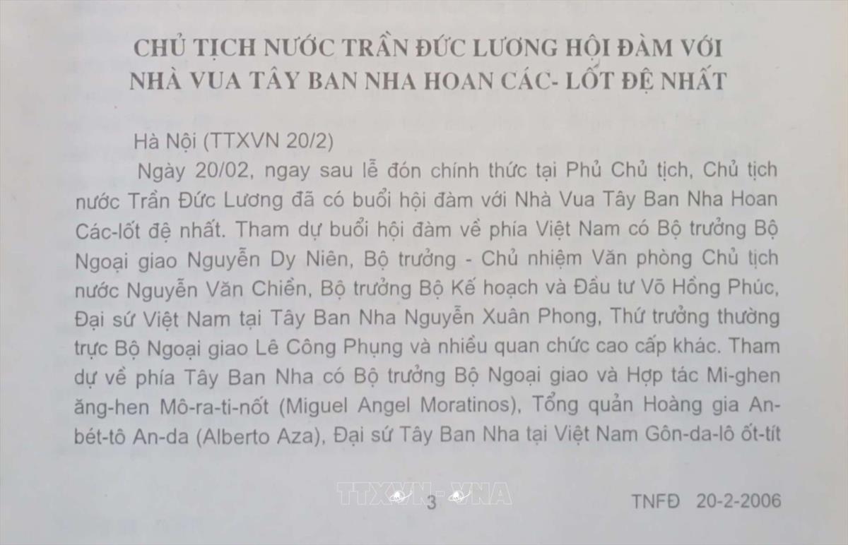 Chủ tịch nước Trần Đức Lương hội đàm với Nhà vua Tây Ban Nha Juan Carlos Đệ nhất Nhân vật liên quanỦy viên Bộ Chính trị Khóa VIII, IX; Chủ tịch nước CHXHCN Việt Nam (1997-2006)Trần Đức Lương Tin Trong nước của Thông tấn xã Việt Nam, ngày 20/2/2006 Từ khóa:Việt Nam-Tây Ban NhaChủ tịch nước Trần Đức LươngNhà vua Tây Ban Nha Juan Carlos