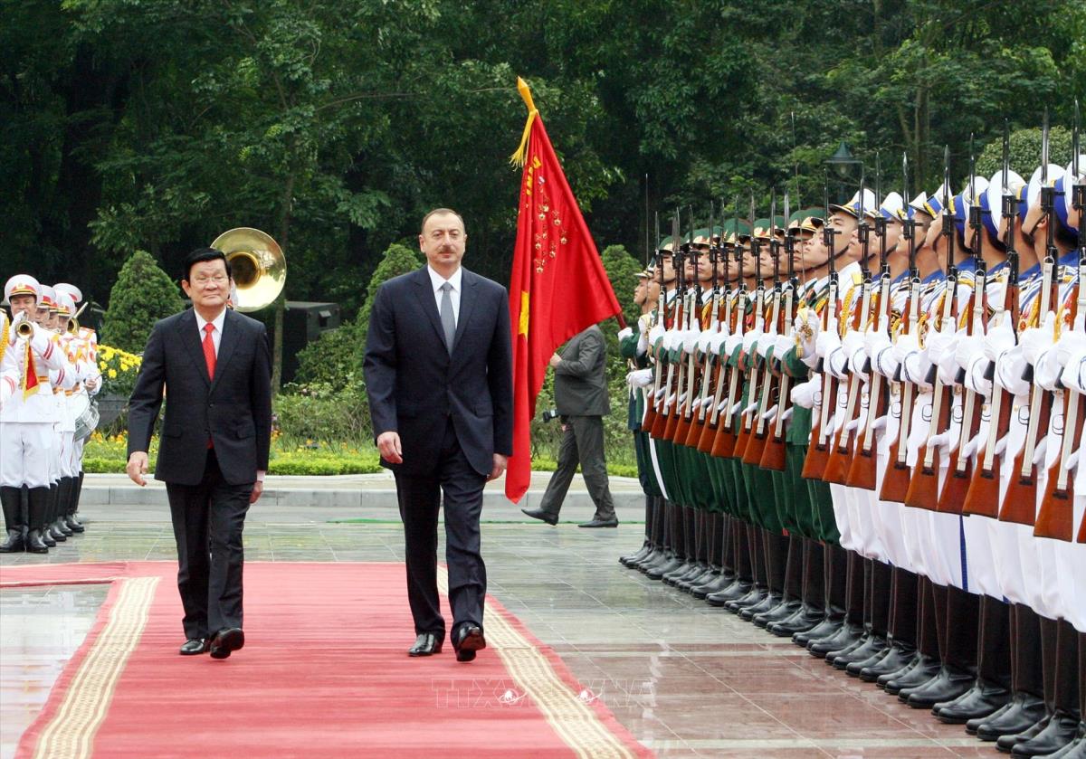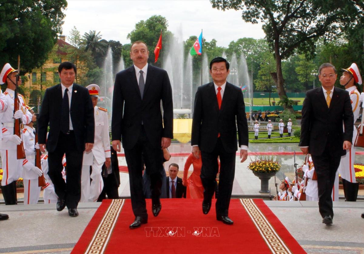 Chủ tịch nước Trương Tấn Sang đón Tổng thống Cộng hòa Azerbaijan Ilham Aliyev (19/5/2014). Ảnh: Nguyễn Khang - TTXVN