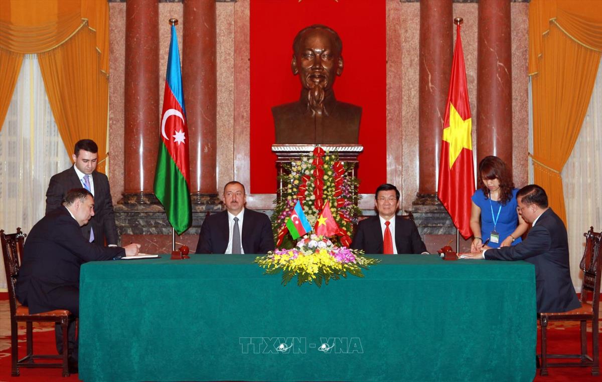 Chủ tịch nước Trương Tấn Sang và Tổng thống llham Aliyev tại Lễ ký kết các hiệp định hợp tác giữa hai nước (19/5/2014). Ảnh: Nguyễn Khang - TTXVN