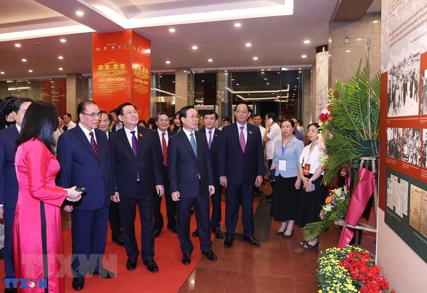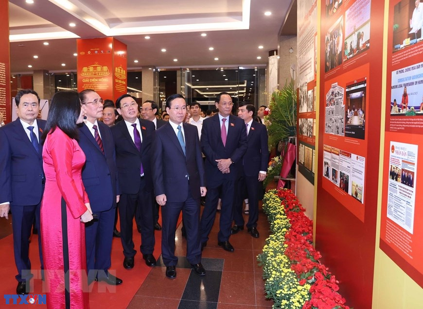 Chủ tịch nước Võ Văn Thưởng, Chủ tịch Quốc hội Vương Đình Huệ và các đại biểu tham quan Triển lãm "Báo chí với hoạt động của Quốc hội, Hội đồng Nhân dân và Khoảnh khắc Diên Hồng". (Ảnh: Thống Nhất/TTXVN)