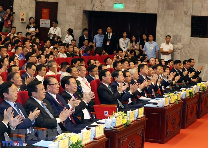 Chủ tịch nước Võ Văn Thưởng, Chủ tịch Quốc hội Vương Đình Huệ và các đại biểu tham dự Lễ trao giải Diên Hồng lần thứ nhất. (Ảnh: Thống Nhất/TTXVN)