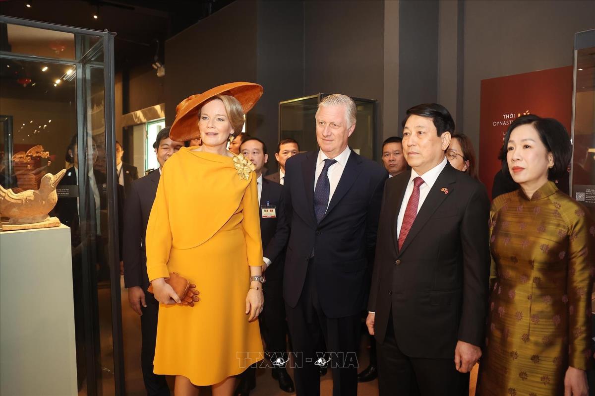 Chủ tịch nước Lương Cường và Phu nhân cùng Nhà Vua Vương quốc Bỉ Philippe và Hoàng hậu Mathilde tham quan các hiện vật trưng bày tại Khu di tích Hoàng thành Thăng Long – Hà Nội (1/4/2025). Ảnh: Lâm Khánh – TTXVN