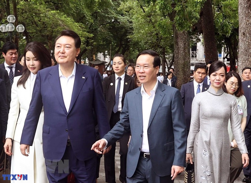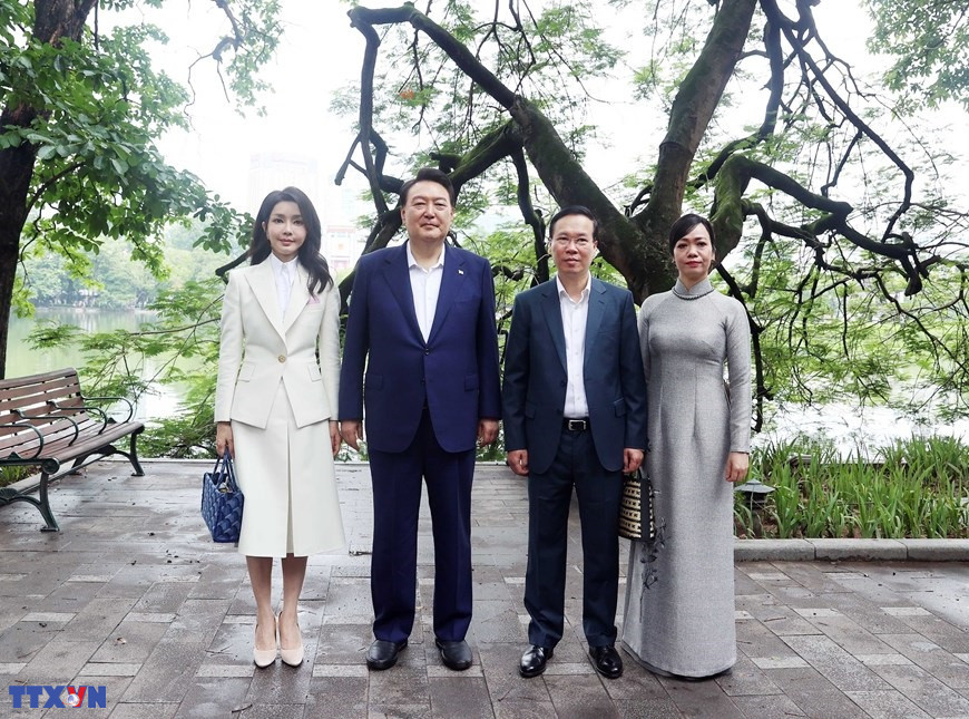 Hà Nội (TTXVN 24/6/2023) Sáng 24/6/2023, Chủ tịch nước Võ Văn Thưởng và Phu nhân cùng Tổng thống Hàn Quốc Yoon Suk Yeol và Phu nhân dự tiệc trà, tham quan danh thắng hồ Hoàn Kiếm, Hà Nội.
