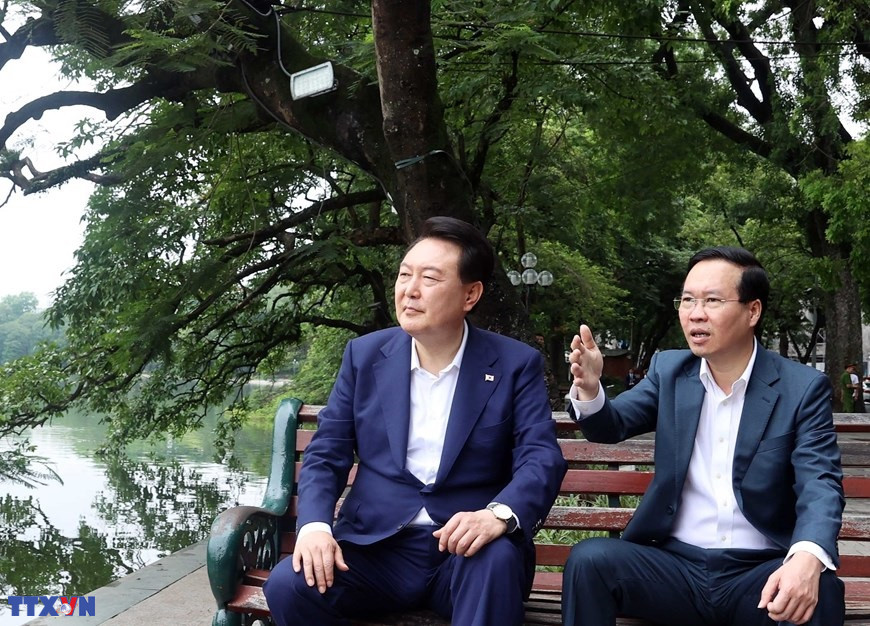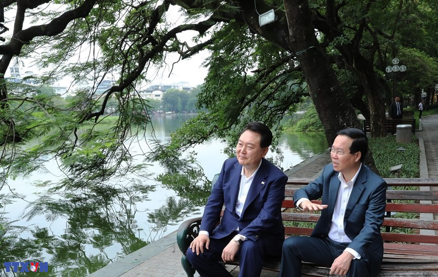 Chủ tịch nước Võ Văn Thưởng giới thiệu với Tổng thống Hàn Quốc Yoon Suk Yeol về ý nghĩa lịch sử của danh thắng hồ Hoàn Kiếm, nơi được coi là trái tim của Thủ đô Hà Nội - Thành phố vì hòa bình. (Ảnh: Lâm Khánh/TTXVN)