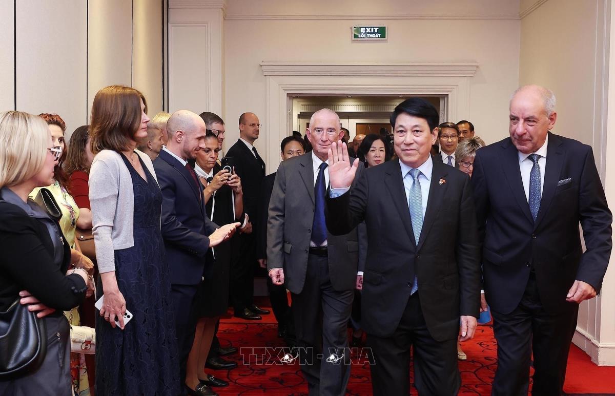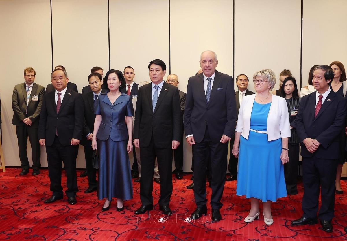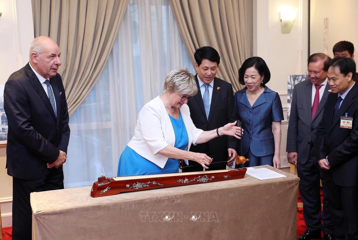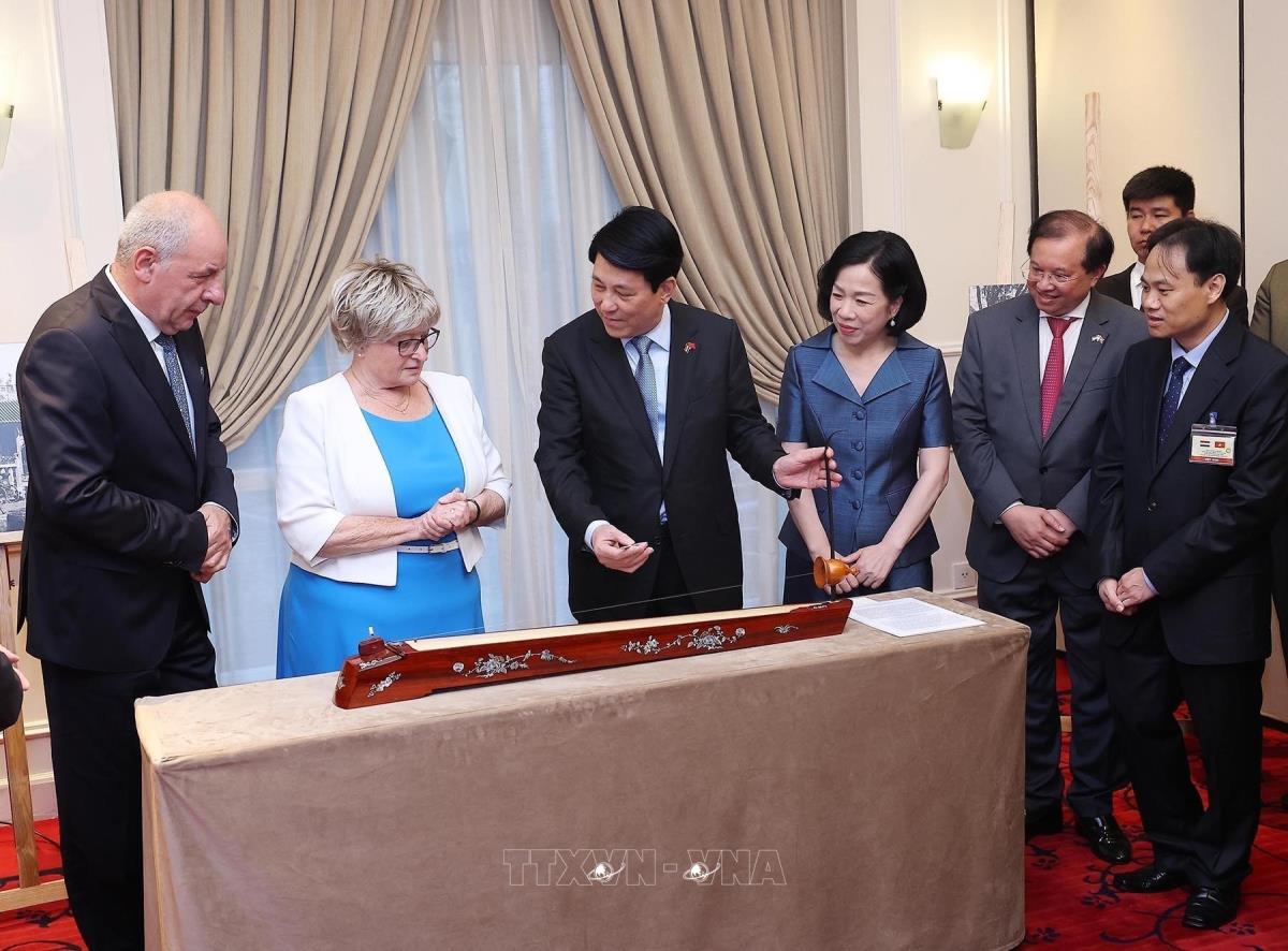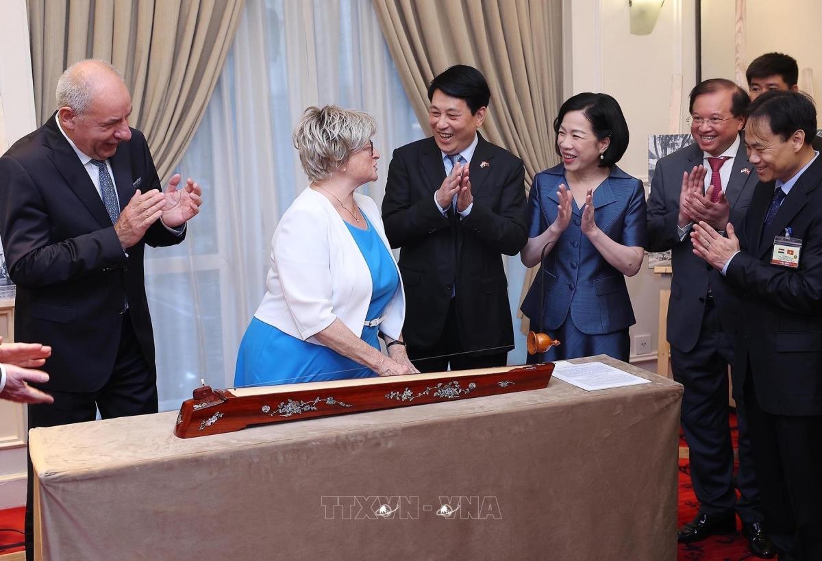 Tại lễ khai mạc trưng bày ảnh, Chủ tịch nước Lương Cường và Phu nhân chứng kiến Phu nhân Tổng thống Hungary Sulyok Tamas trải nghiệm đánh đàn bầu truyền thống của Việt Nam (28/5/2025). Ảnh: Lâm Khánh – TTXVN