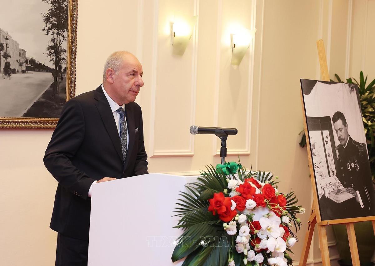 Tổng thống Hungary Sulyok Tamas phát biểu khai mạc trưng bày ảnh (28/5/2025). Ảnh: Lâm Khánh - TTXVN