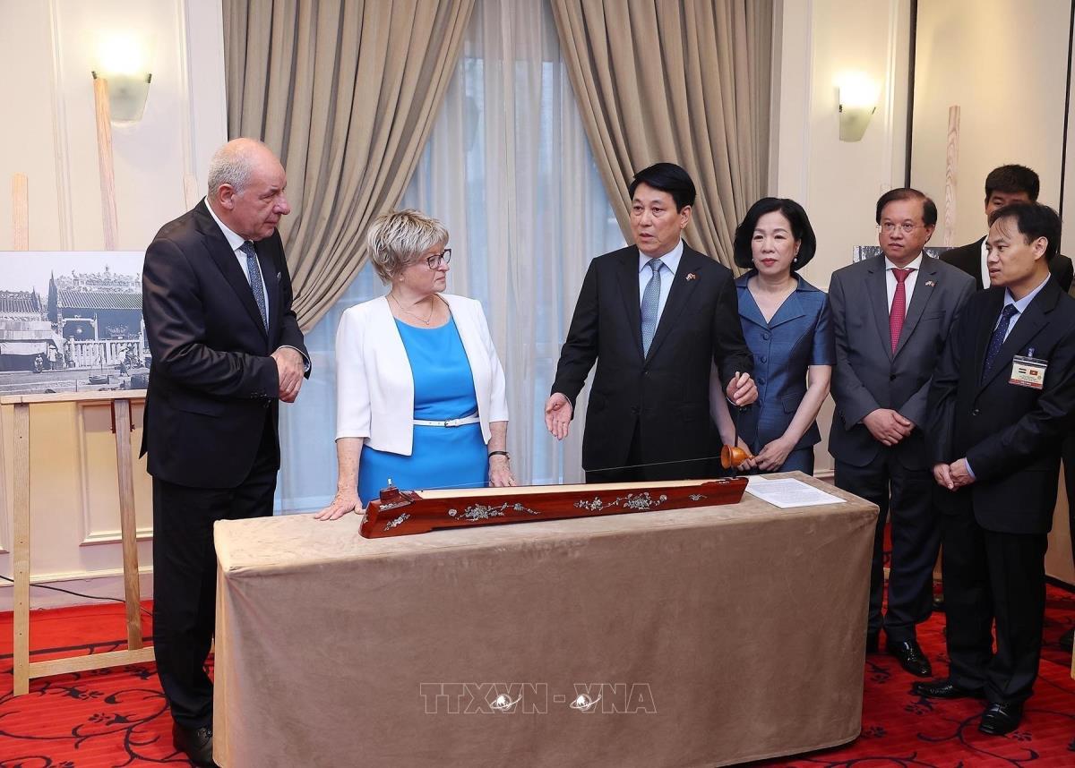 Tại lễ khai mạc trưng bày ảnh, Chủ tịch nước Lương Cường tặng và giới thiệu với Tổng thống Hungary Sulyok Tamas và Phu nhân về chiếc đàn bầu của Việt Nam (28/5/2025). Ảnh: Lâm Khánh – TTXVN