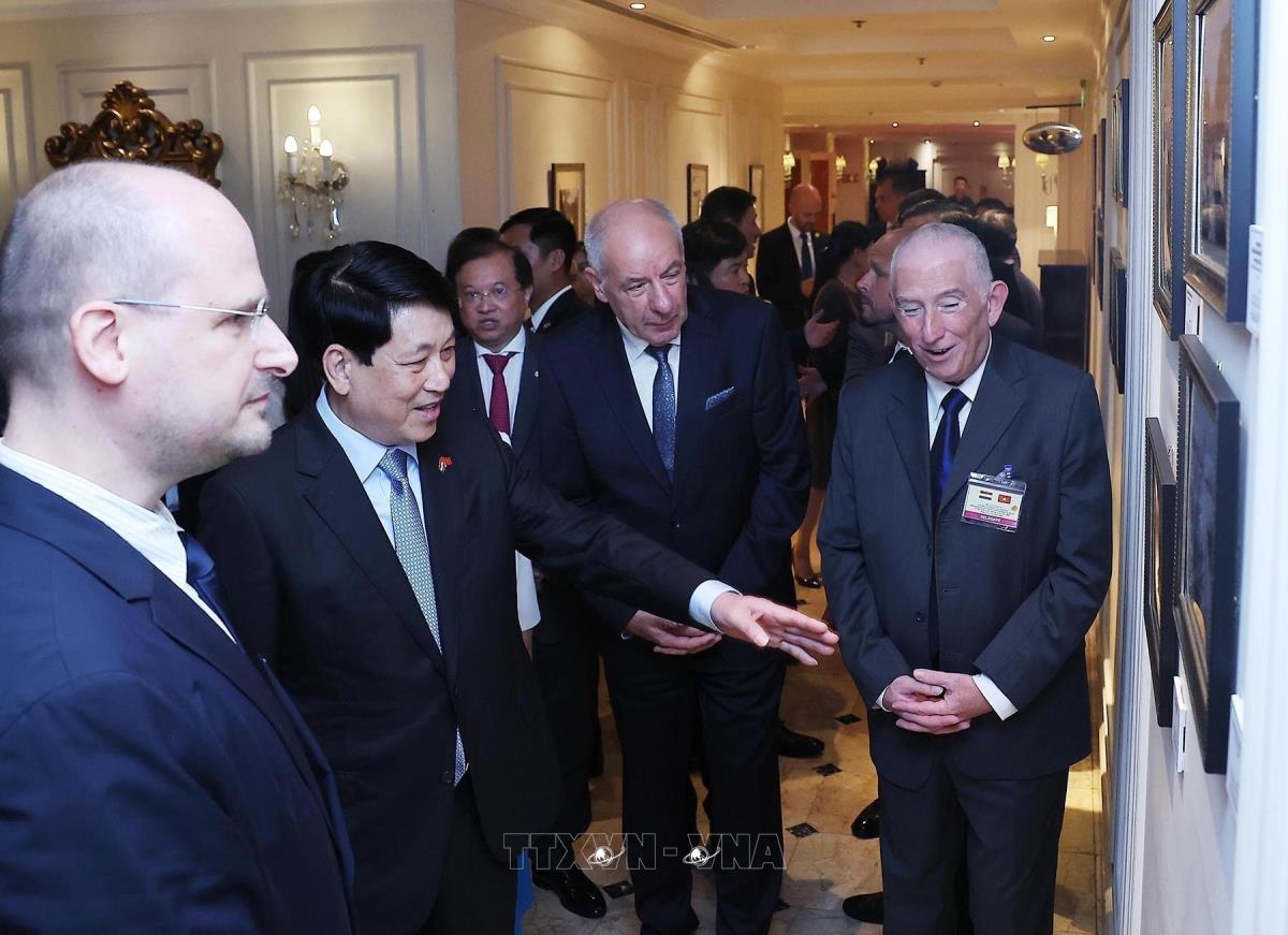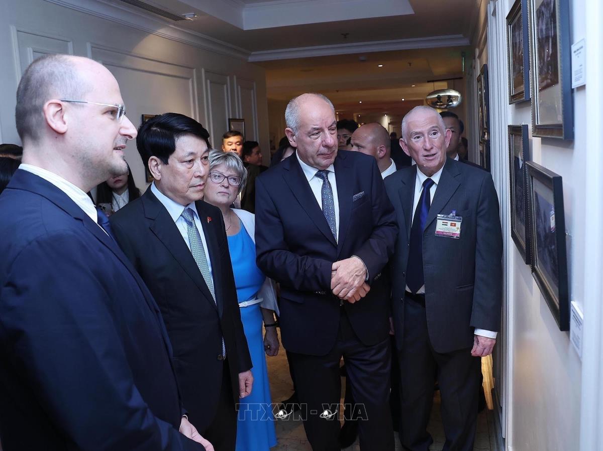 Chủ tịch nước Lương Cường và Phu nhân cùng Tổng thống Hungary Sulyok Tamas và Phu nhân xem trưng bày ảnh (28/5/2025). Ảnh: Lâm Khánh – TTXVN