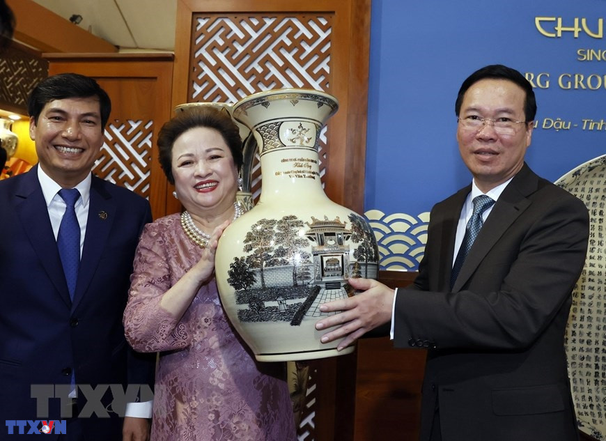 Đại diện Công ty Gốm Chu Đậu tặng quà lưu niệm cho Chủ tịch nước Võ Văn Thưởng. (Ảnh: Thống Nhất/TTXVN)