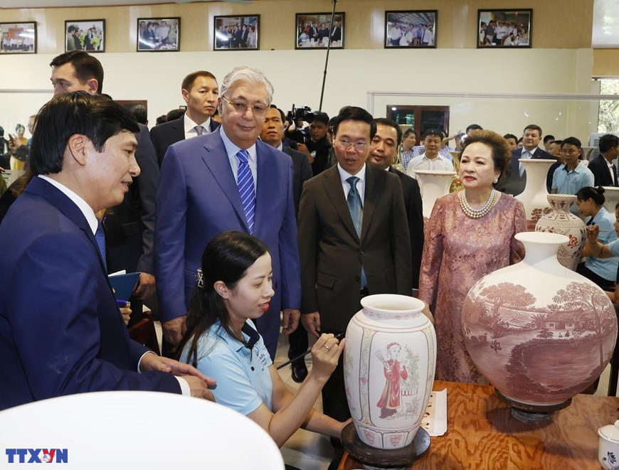 Chủ tịch nước Võ Văn Thưởng và Tổng thống Kazakhstan Kassym-Jomart Tokayev xem nghệ nhân hoàn thiện Chu Đậu. (Ảnh: Thống Nhất/TTXVN)