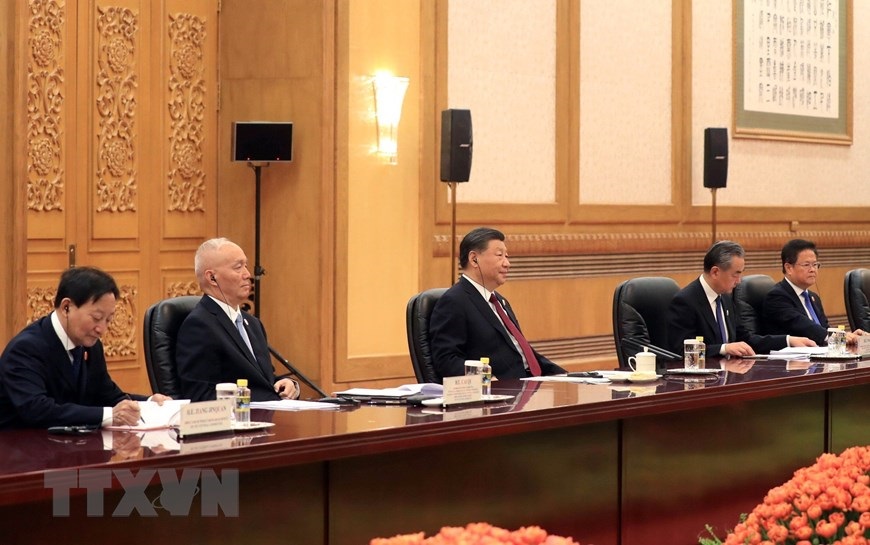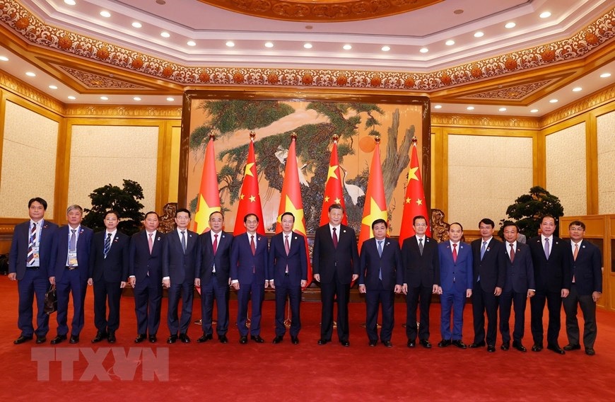 Chủ tịch nước Võ Văn Thưởng và Tổng Bí thư, Chủ tịch Trung Quốc Tập Cận Bình với các đại biểu hai nước. (Ảnh: Thống Nhất/TTXVN)