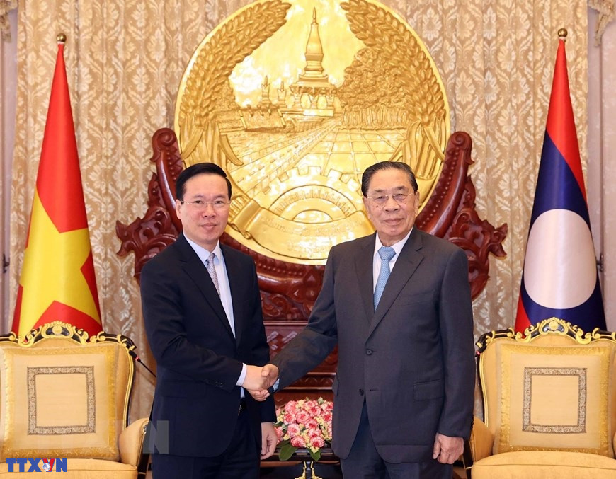 Chủ tịch nước Võ Văn Thưởng với nguyên Tổng Bí thư, Chủ tịch nước Lào Choummaly Sayasone. (Ảnh: Thống Nhất/TTXVN)