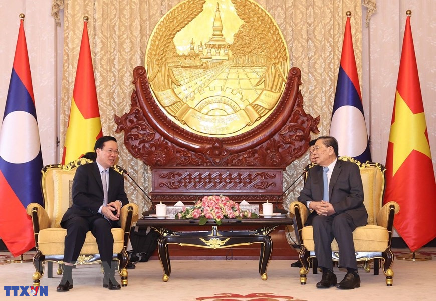 Chủ tịch nước Võ Văn Thưởng thăm nguyên Thủ tướng Lào Thongsing Thammavong. (Ảnh: Thống Nhất/TTXVN)